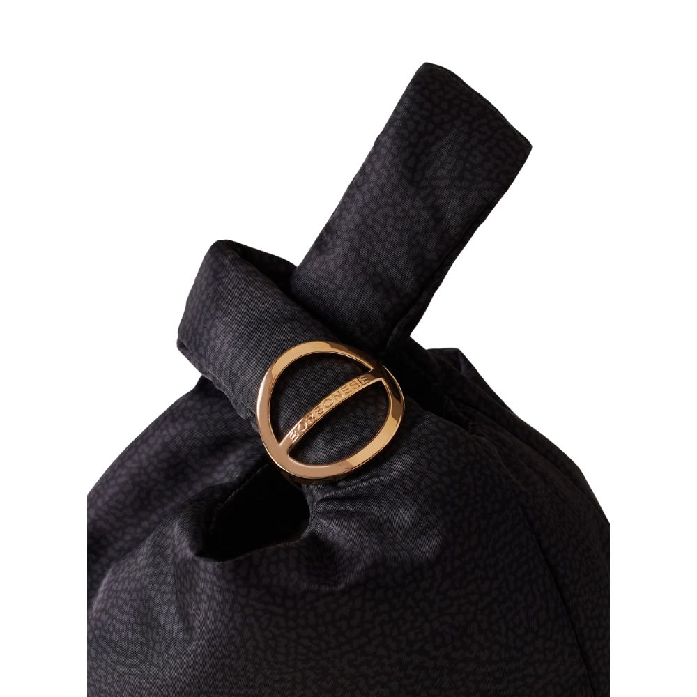 Die Borbonese-Handtasche aus der Twinnie-Linie kann in der Hand getragen werden, indem die beiden Griffe gekreuzt werden, wodurch ein hübscher Schleifeneffekt entsteht.