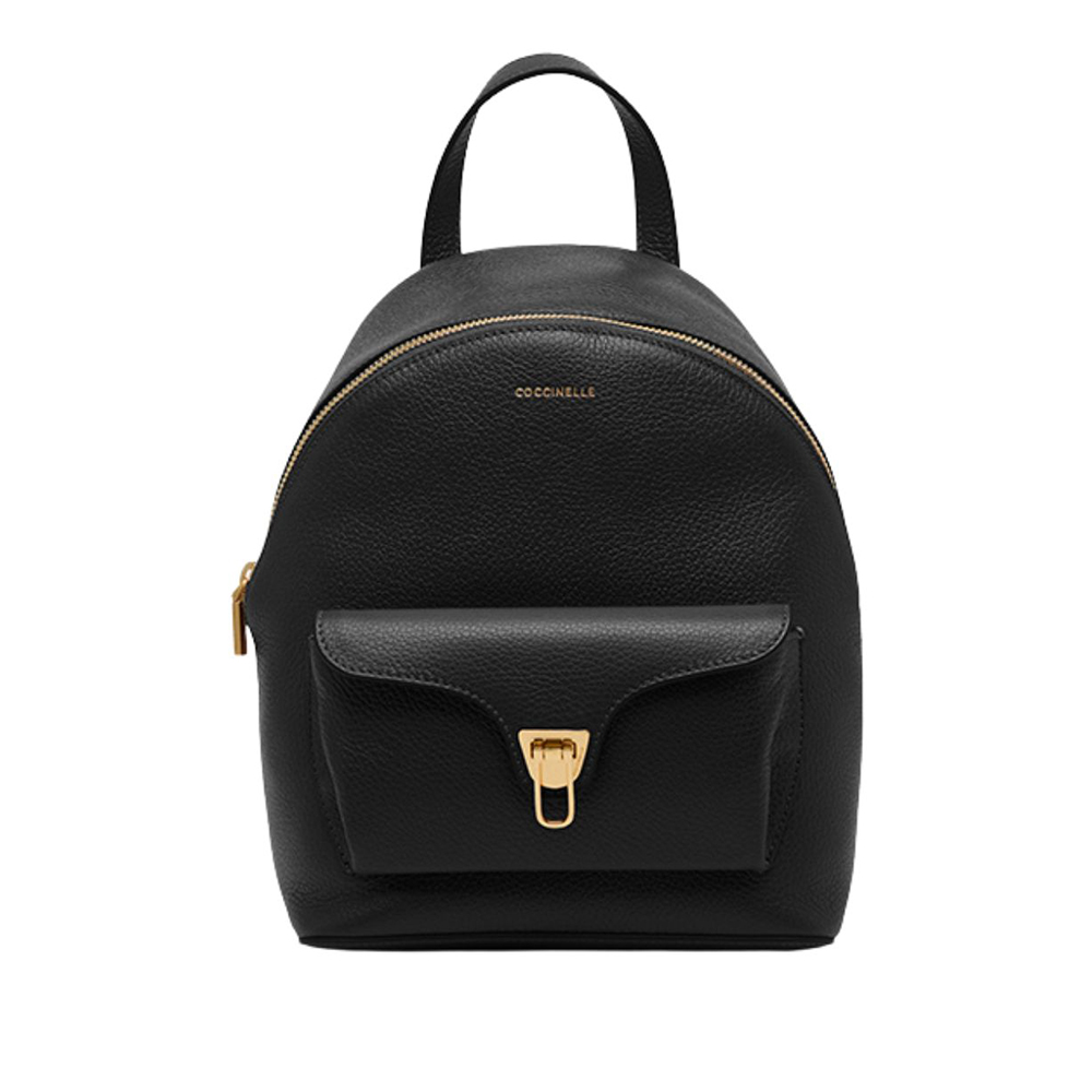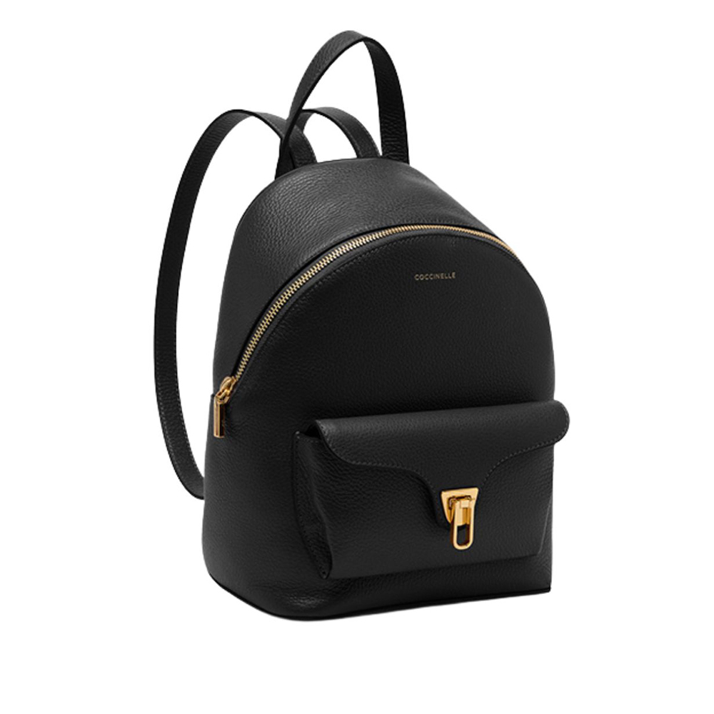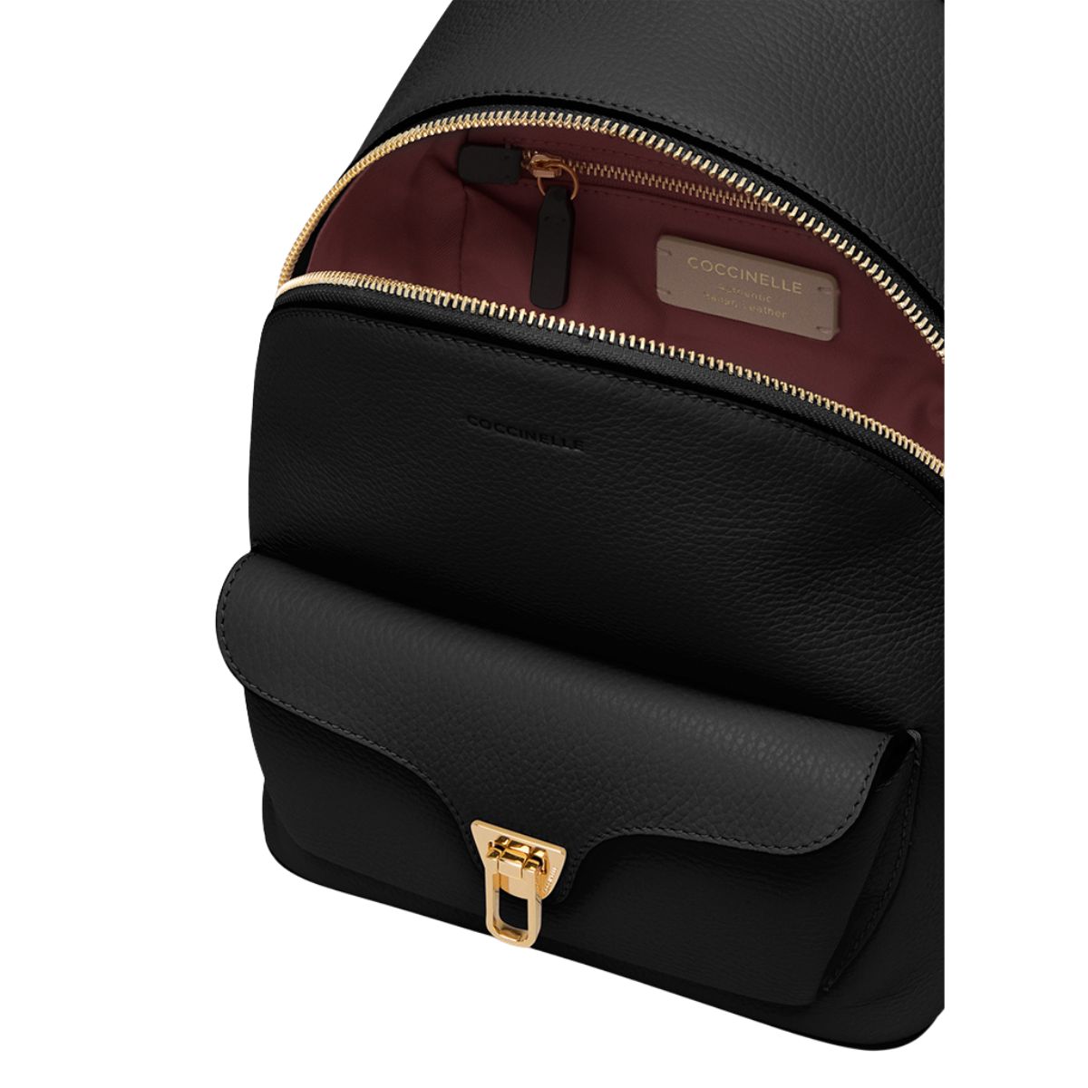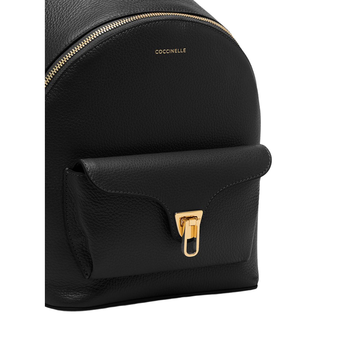 Der komfortable und elegante Coccinelle Beat Rucksack verfügt über eine Außentasche mit dem ikonischen, plektrumförmigen Metallverschluss.