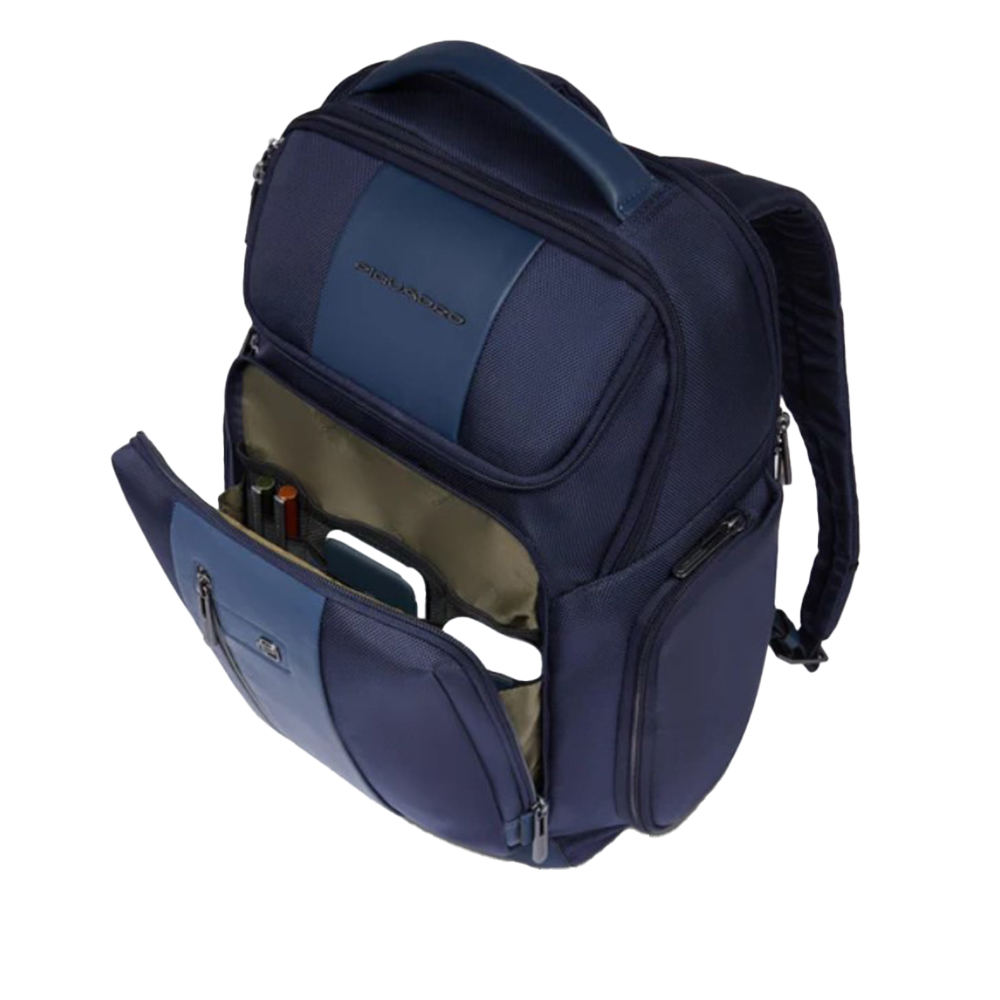Rucksack für PC und iPad Pro 12,9" von Piquadro aus recyceltem Stoff und Leder mit Anti-Schock- und RFID-Schutz und AirPods-Tasche.