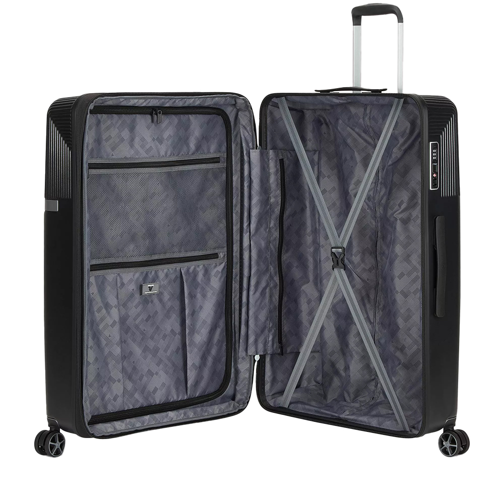 Der große Airglam-Trolley von Roncato wurde vollständig in Italien entworfen und eignet sich für die Bedürfnisse von Reisenden. Die interne Organisation ermöglicht es, alles am besten zu organisieren dank Gummibändern zum Fixieren von Kleidung, Trennwänden und speziellen Fächern.