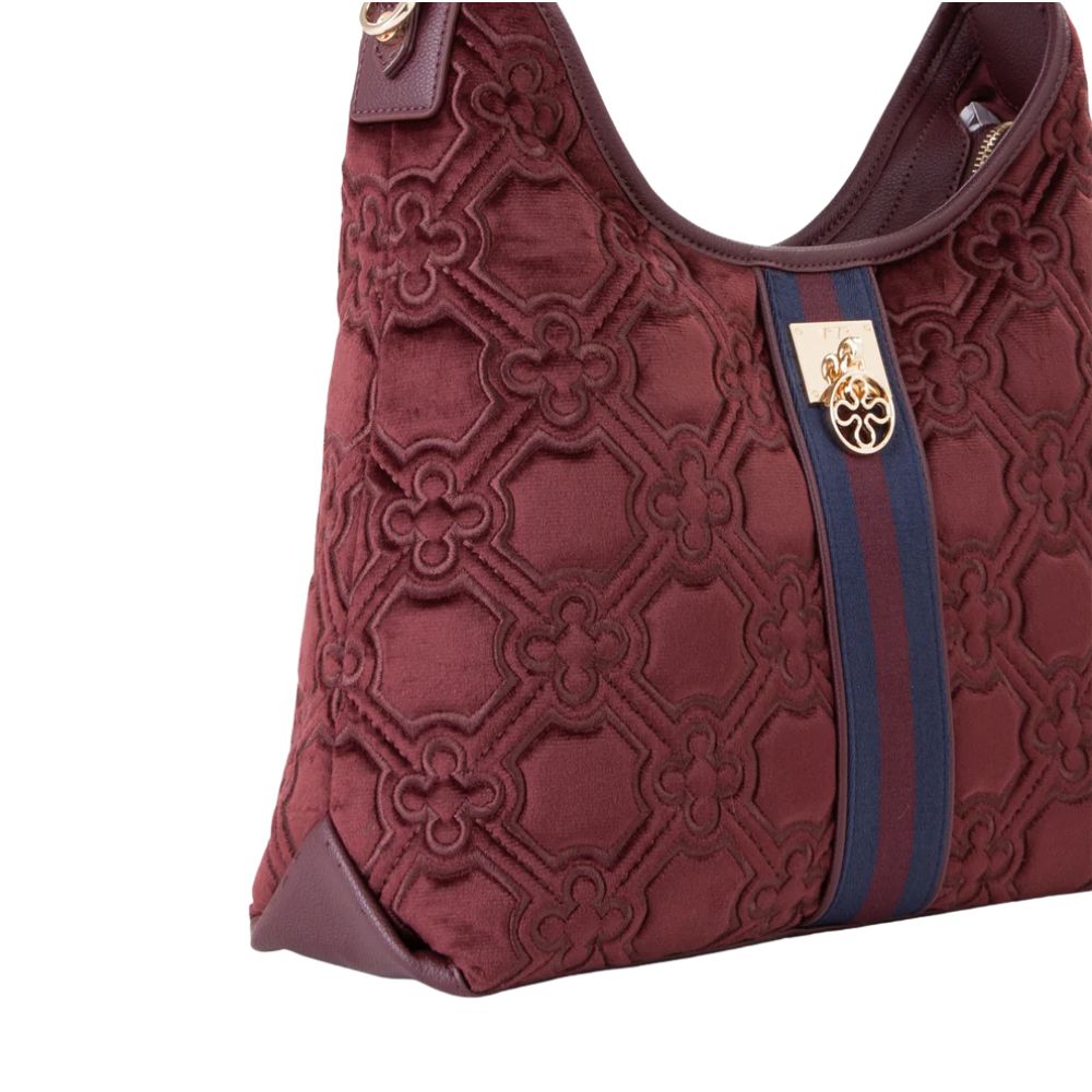 Die Hobo-Tasche Cate von V73 aus Samt mit All-over-Stickerei, personalisiert mit metallischem Floran und zentralem Band.