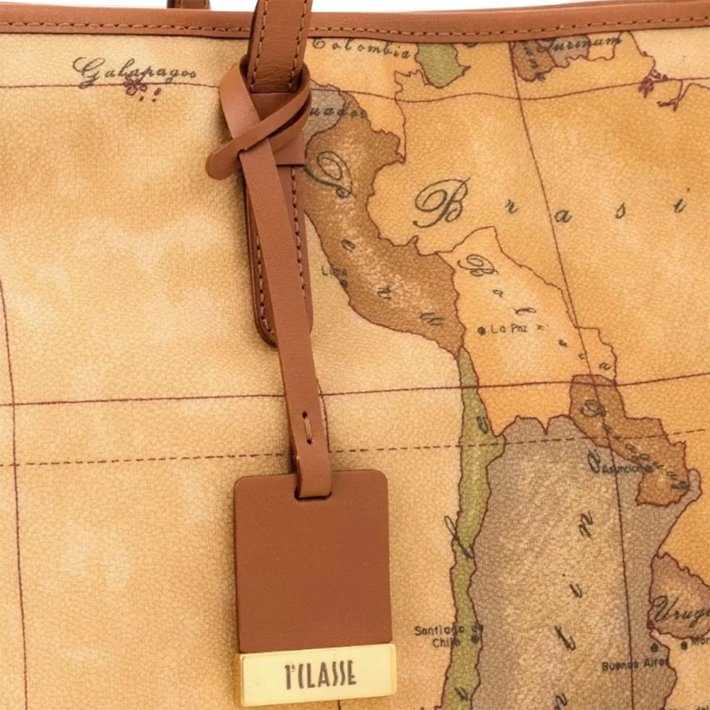 The Geo Classic shoulder bag by Alviero Martini in embossed Geo Classic print fabric with details and cowhide leather trim.