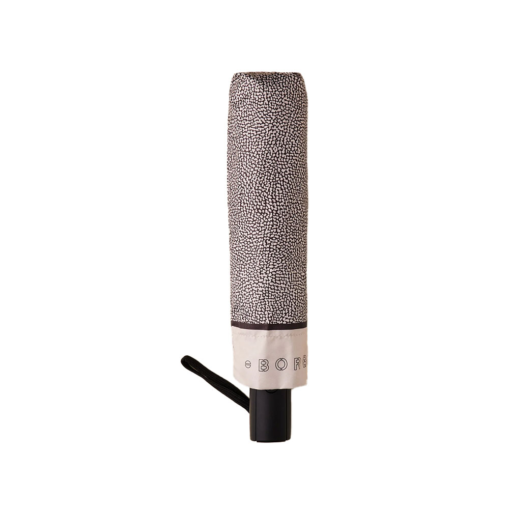 The Borbonese umbrella is able to add a touch of class in rainy days. The waterproof fabric is printed with the iconic OP pattern. The edge, with the brands lettering and its iconic screws, adds a character note. Foldable and with the practical snap opening, it fits comfortably in your bag.