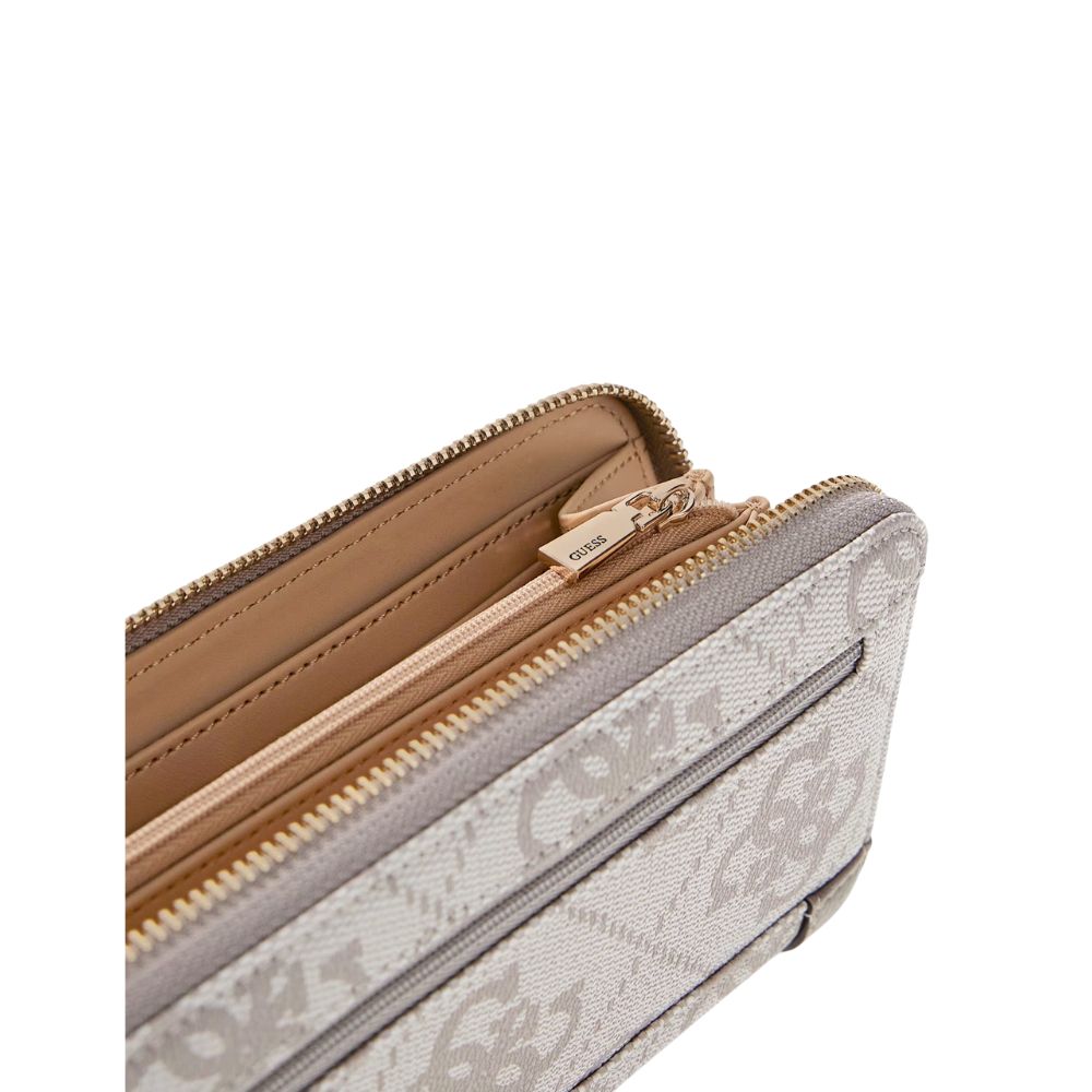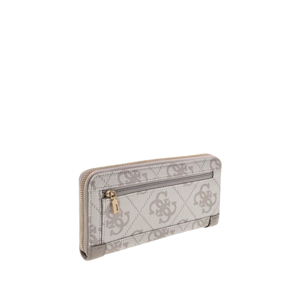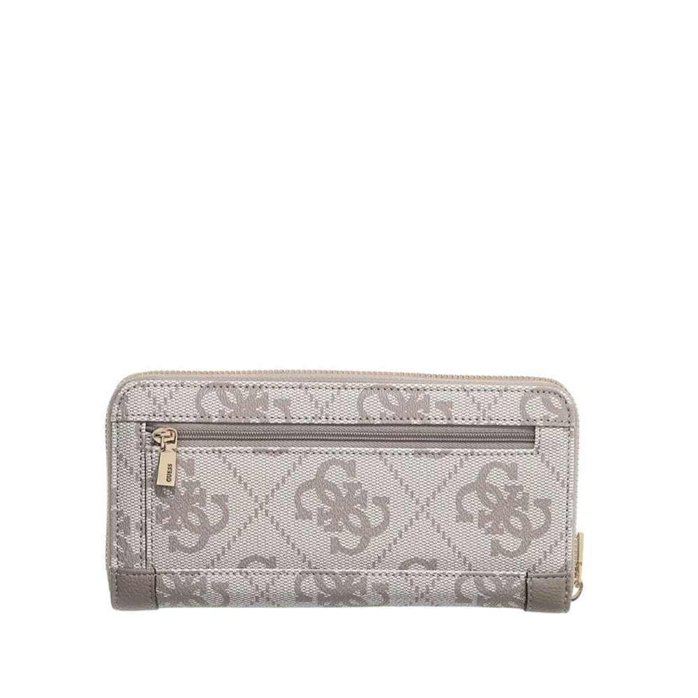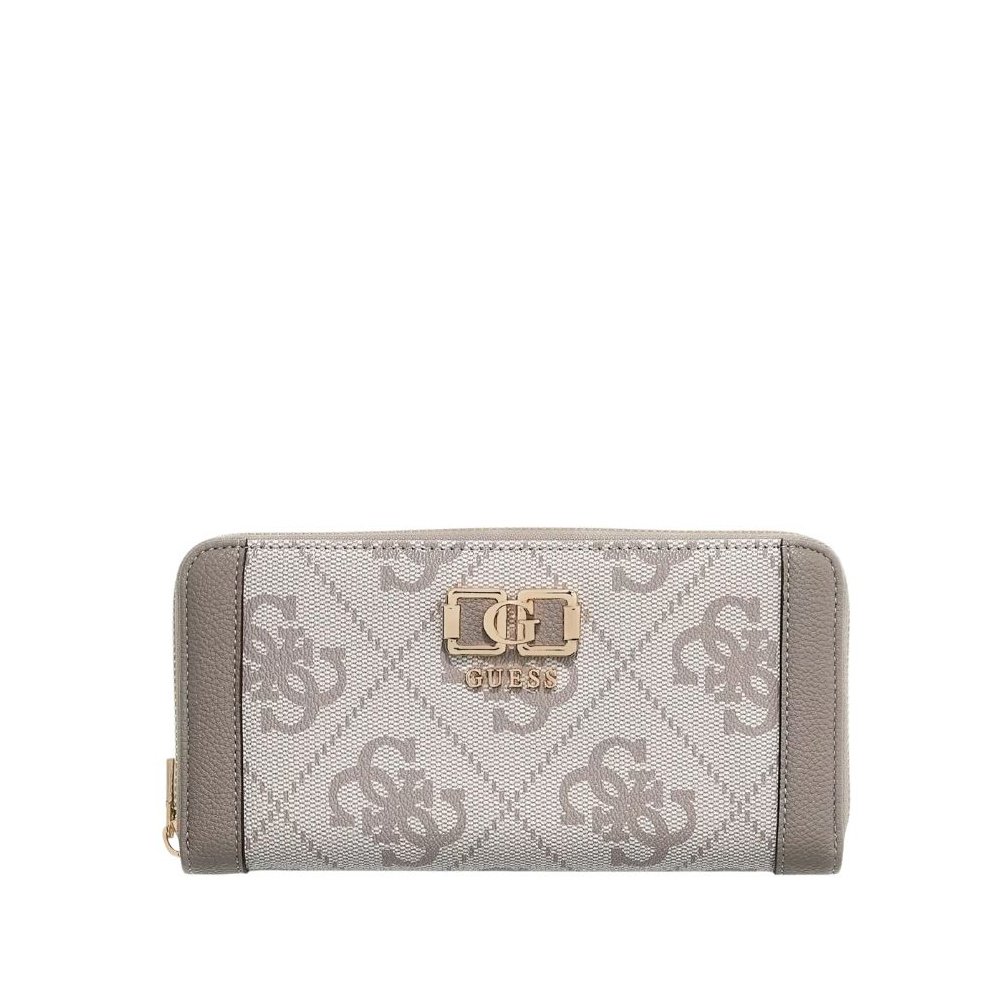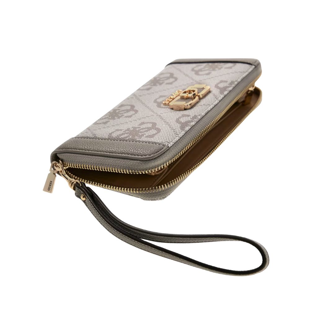 The Karnilla 4g Maxi women's wallet from Guess has a zip-around closure. This wallet features a large card holder, zip-lock coin pocket, and a detachable wristband.