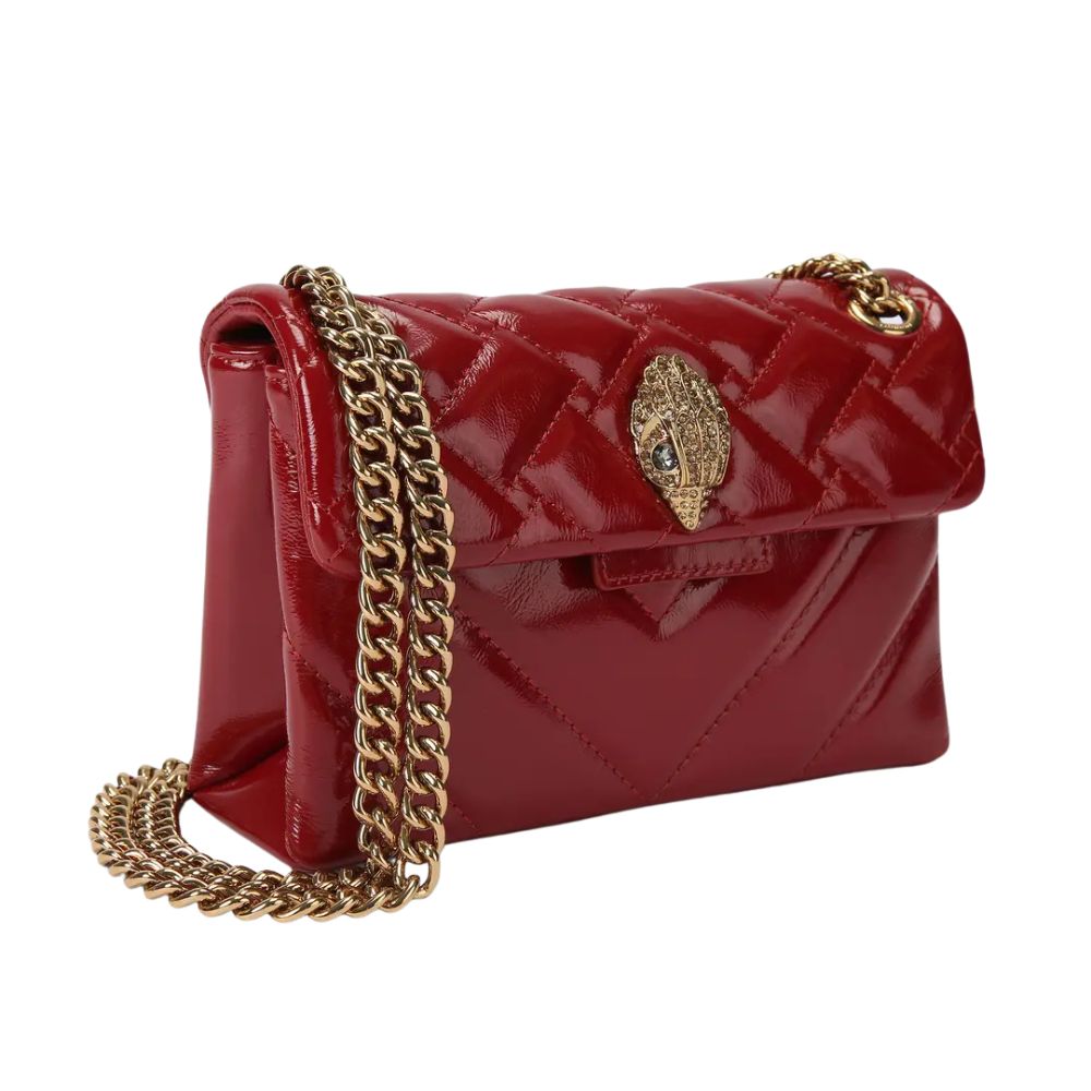 The Fabric Mini Kensington is crafted from a red patent leather with weave and chevron stitch design. The front flap is topped with shiny brass eagle head with crystal embellishment.