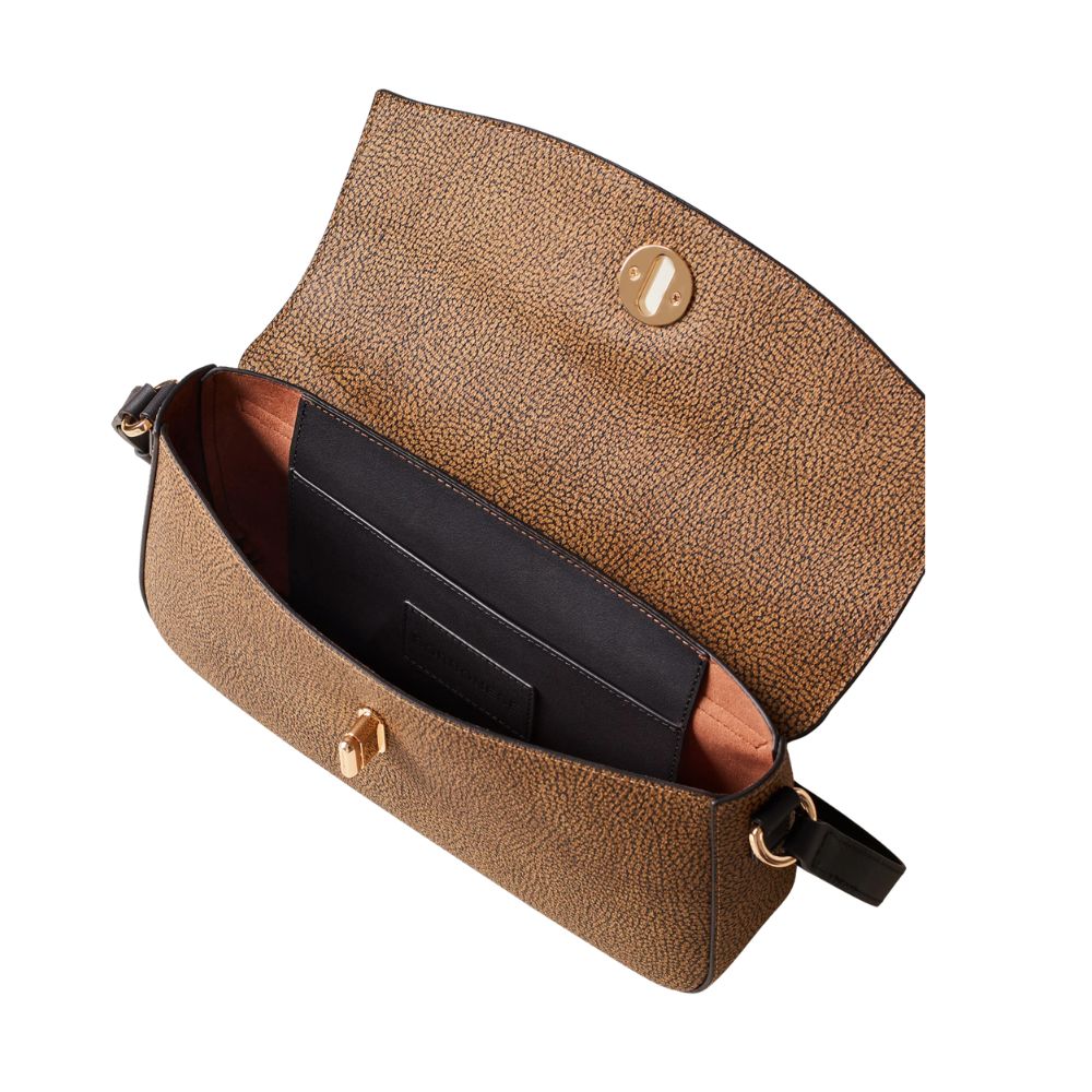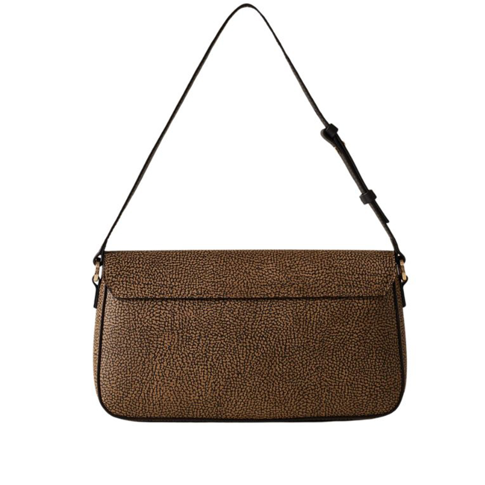 La borsa a spalla Moonlight di Borbonese è caratterizzata da forme semplici, ma con dettagli ispirati al DNA della tradizione Borbonese.