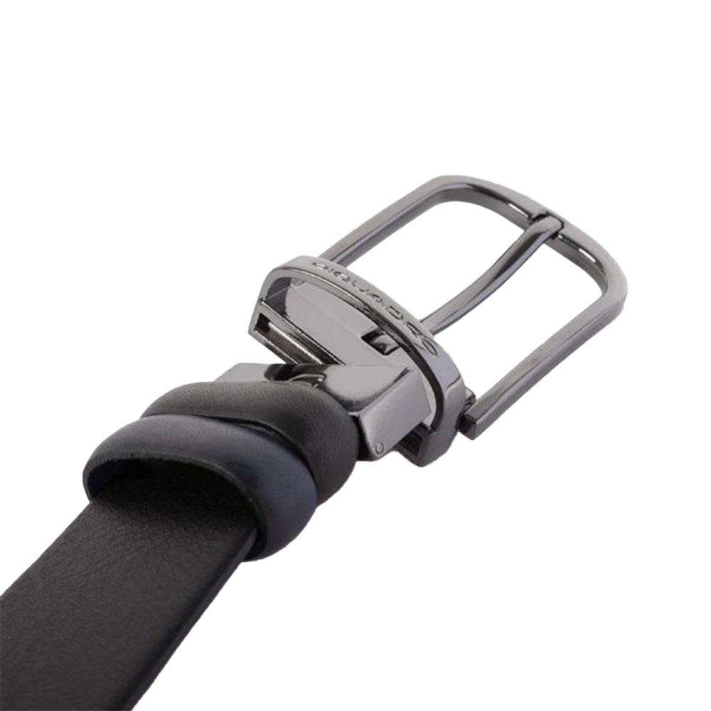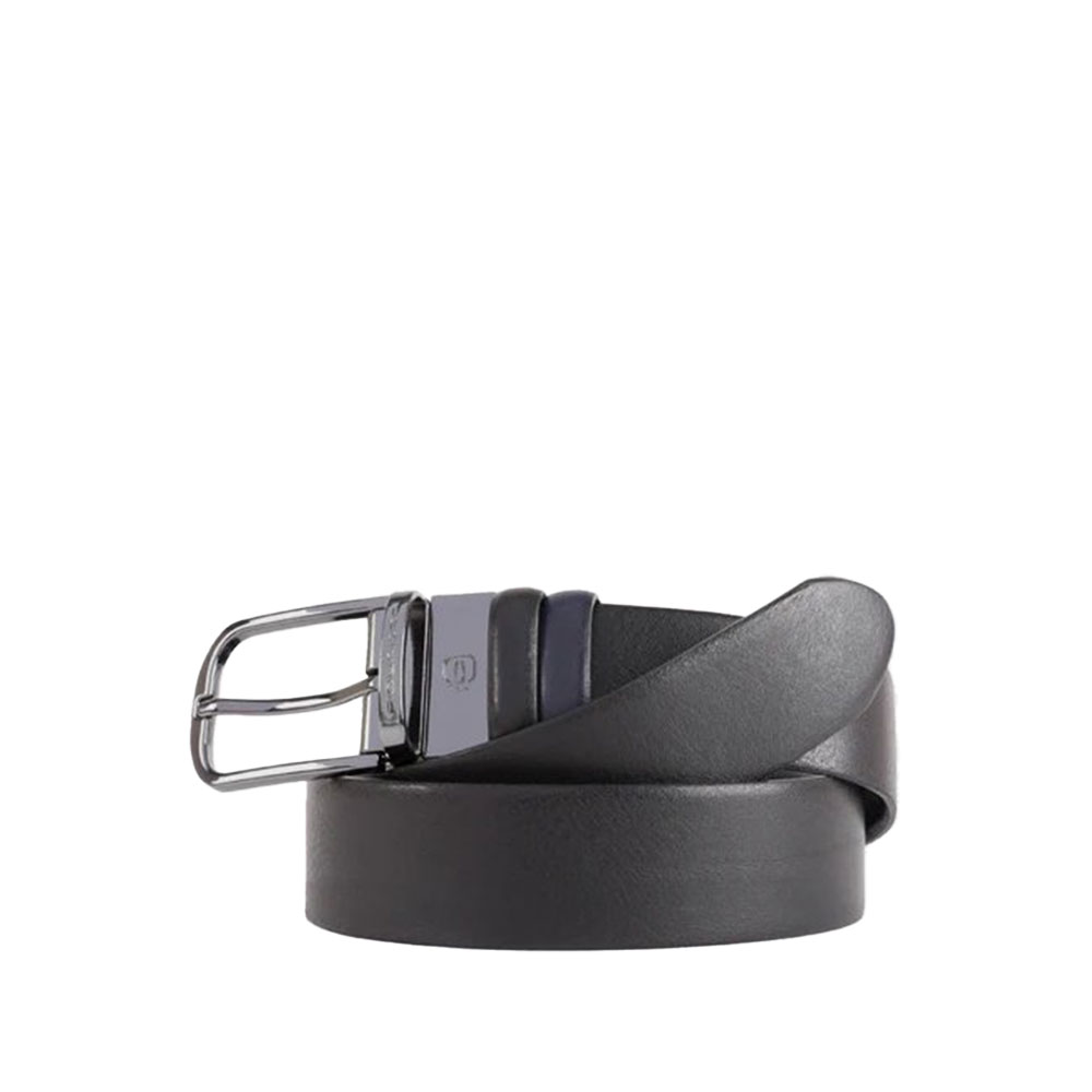 Cintura uomo di Piquadro reversibile con fibbia ad ardiglione. Da un lato la cinta è di colore nero e dall'altro è blu.