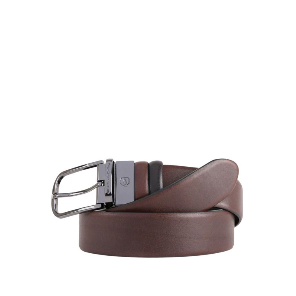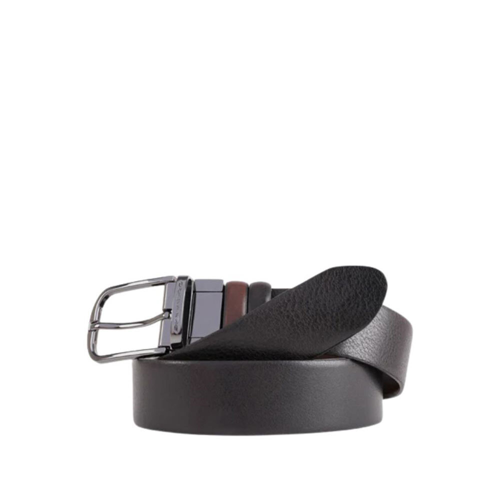 Cintura uomo di Piquadro reversibile con fibbia ad ardiglione. Da un lato la cinta è di colore nero e dall'altro è blu.