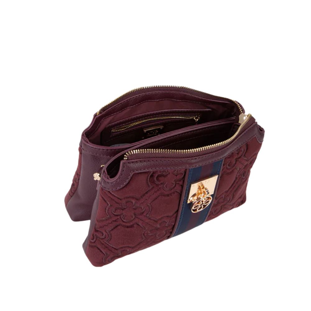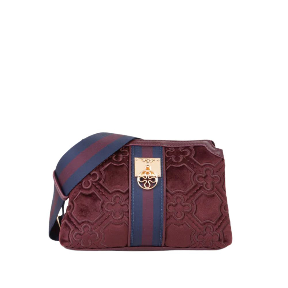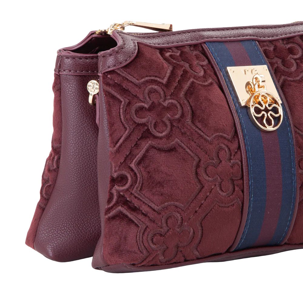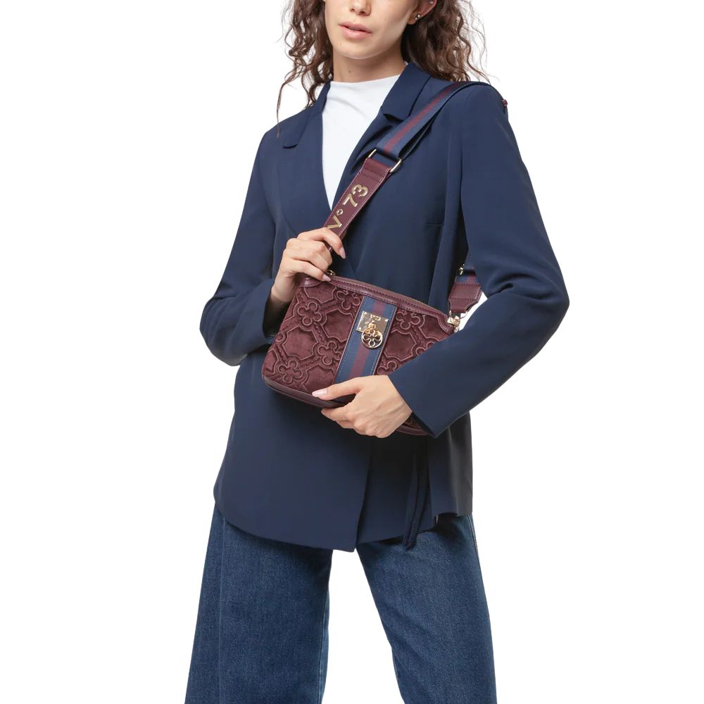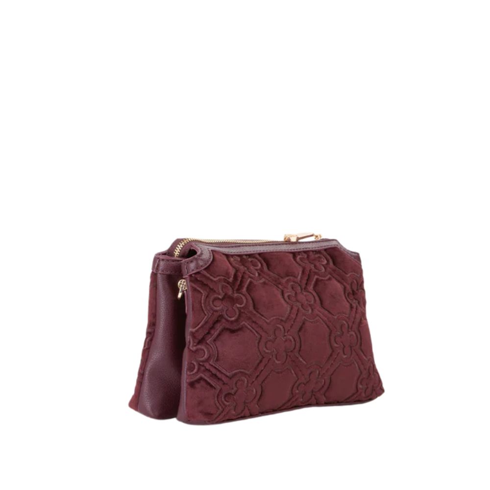 La borsa a spalla Cate di V73 realizzata in velluto con ricamo all over, personalizzata con fiorone metallico e nastro centrale.