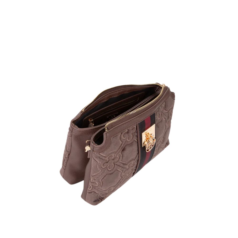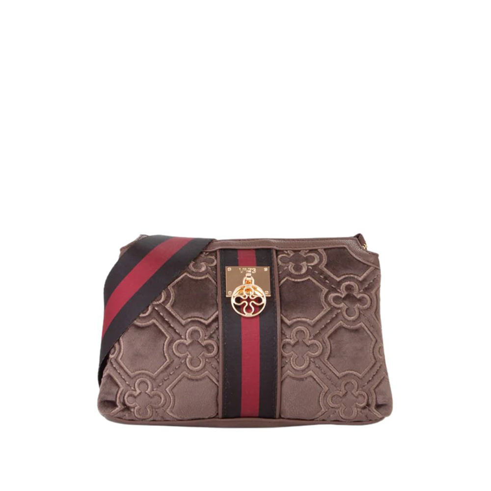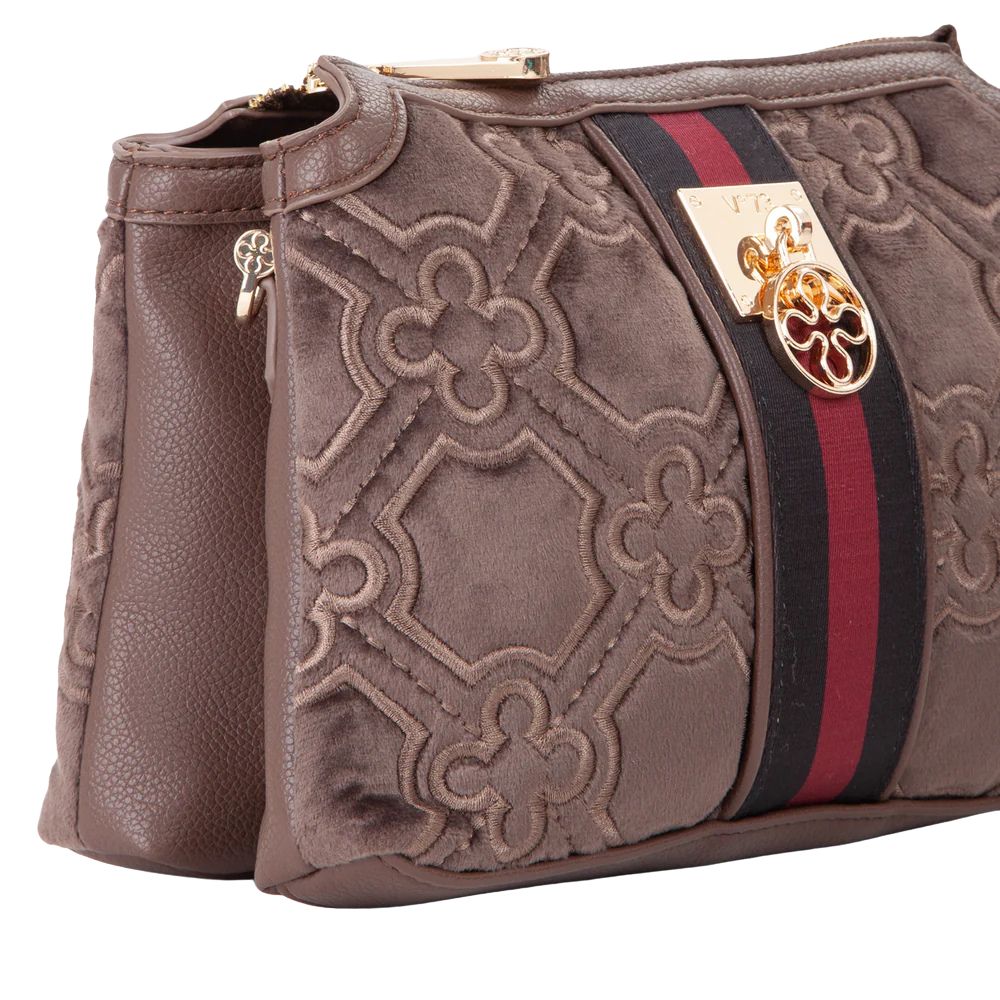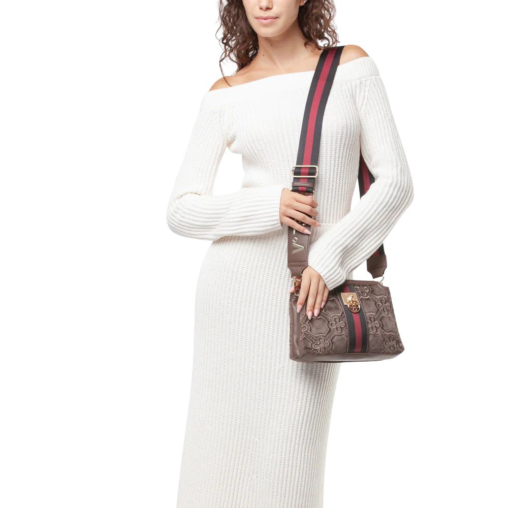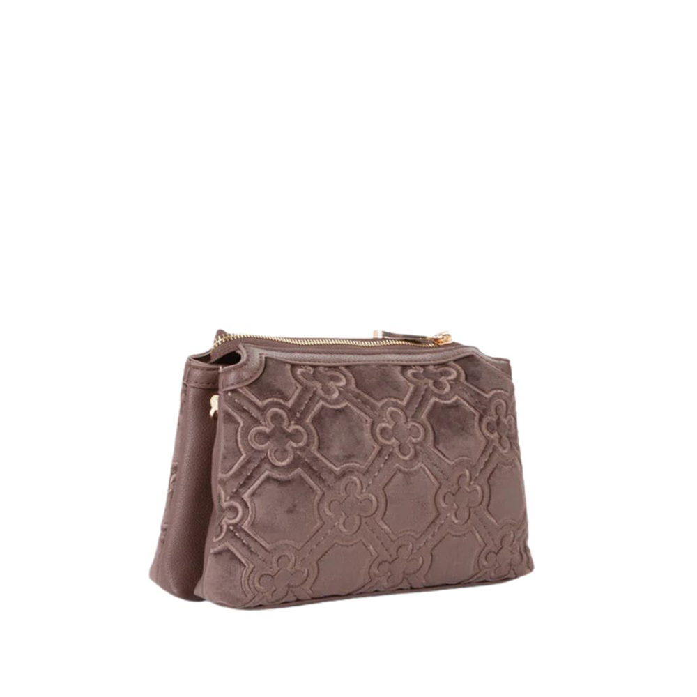 La borsa a spalla Cate di V73 realizzata in velluto con ricamo all over, personalizzata con fiorone metallico e nastro centrale.