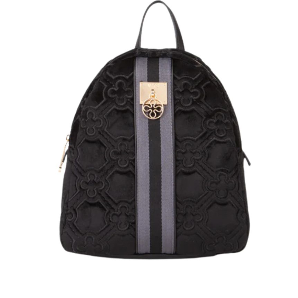 Lo zaino Cate di V73 è realizzato in velluto con ricamo all over, personalizzato con fiorone metallico e nastro centrale.