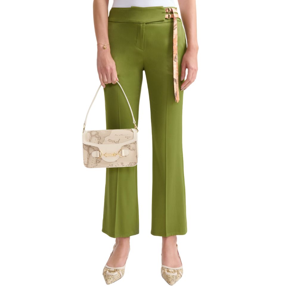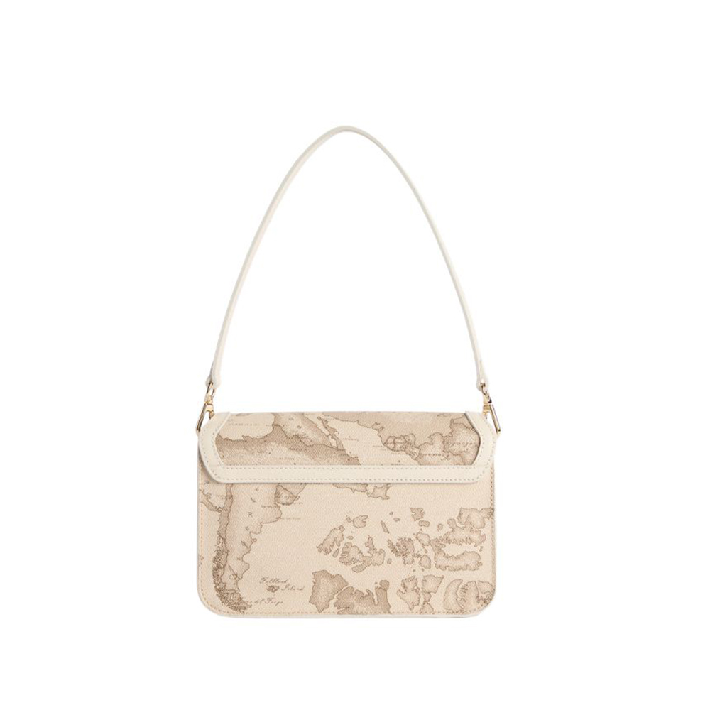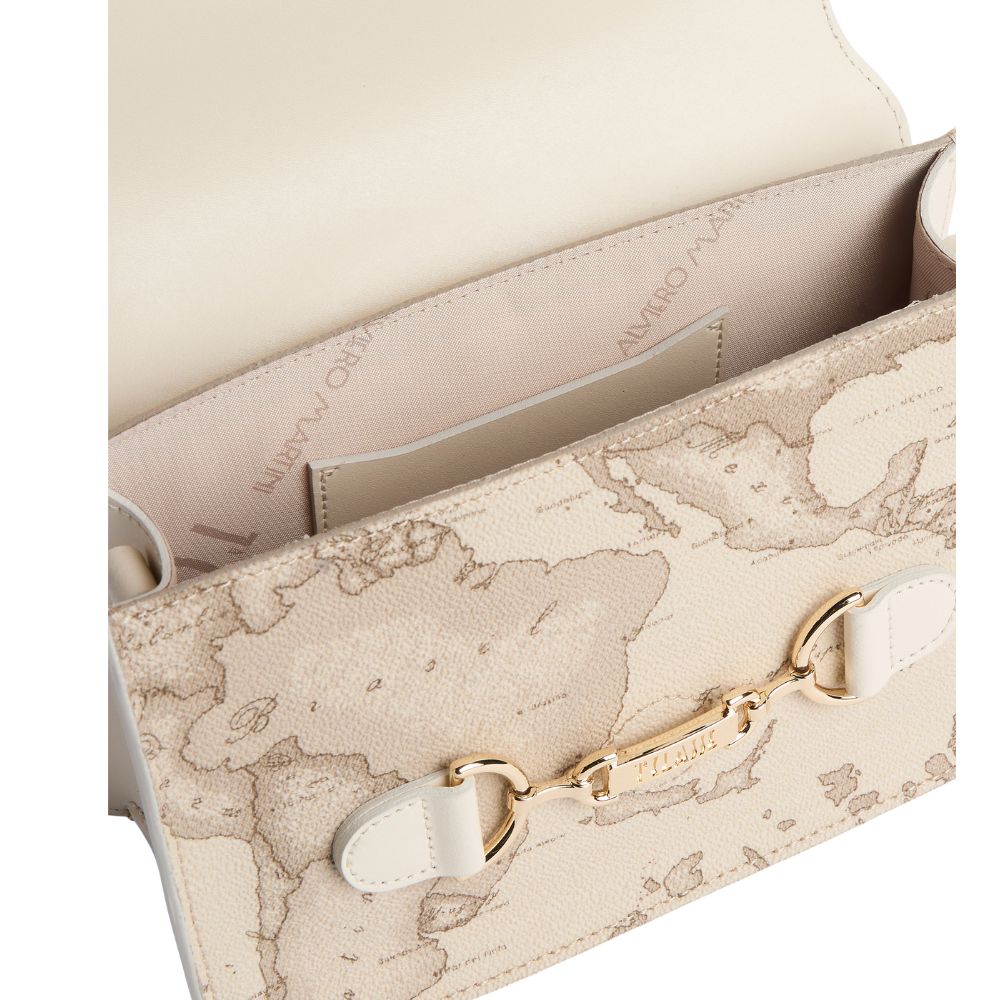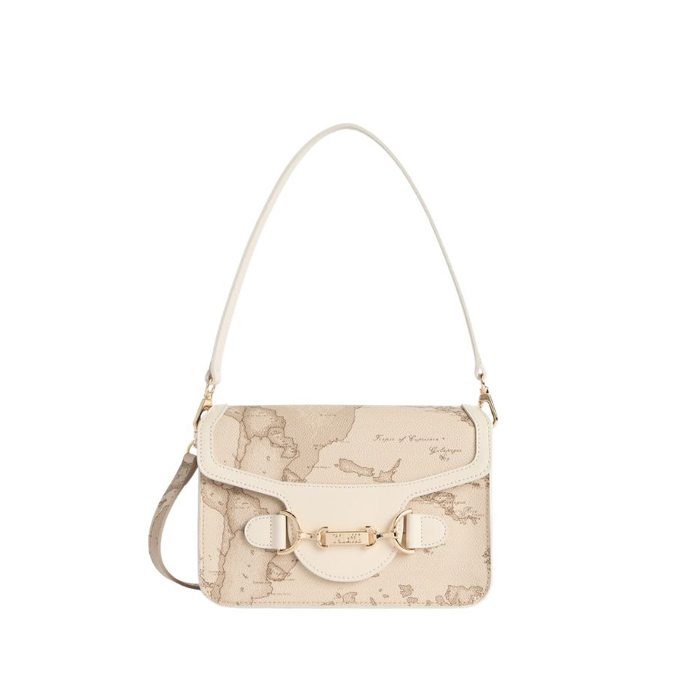 Die Schultertasche Cruise Bag von Alviero Martini in der Geo Safari-Version kombiniert die staubigen Farbtöne des Stoffes mit dem glatten Leder in der Farbe Rafia, das die Hüften und das Profil der geformten Patta definiert. Die große Lasche schließt die Tasche und fügt sich in den neuen Griff mit hellgoldener Oberfläche ein, wo das eingravierte 1A-Klasse-Logo den Charakter der Marke unterstreicht. Das Modell wird durch ein Schulterband aus glattem Leder und einen Sling aus dem Stoff Geo Safari ergänzt, die beide abnehmbar sind: Die strukturierten Linien und die zarte Palette machen es zu einem eleganten und vielseitigen Modell, perfekt sowohl für lässig-schicke Looks als auch für ein zeremonielles Outfit.