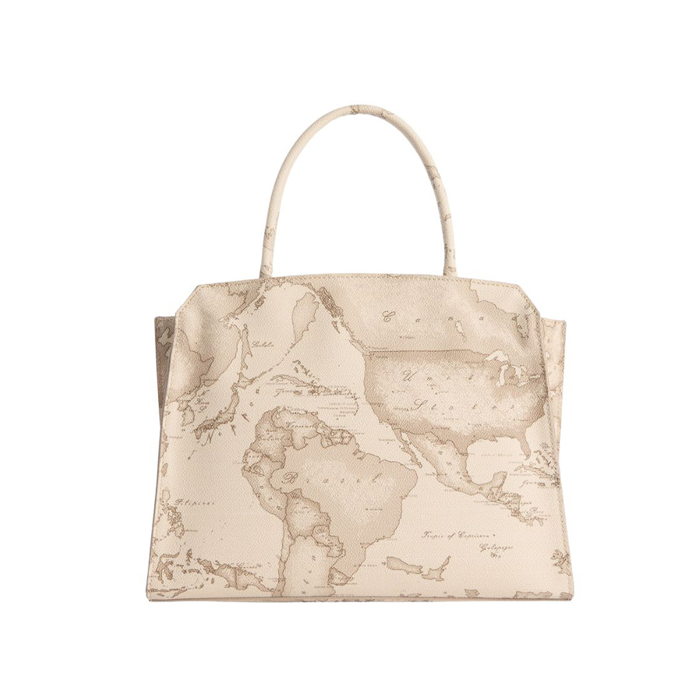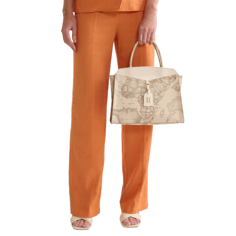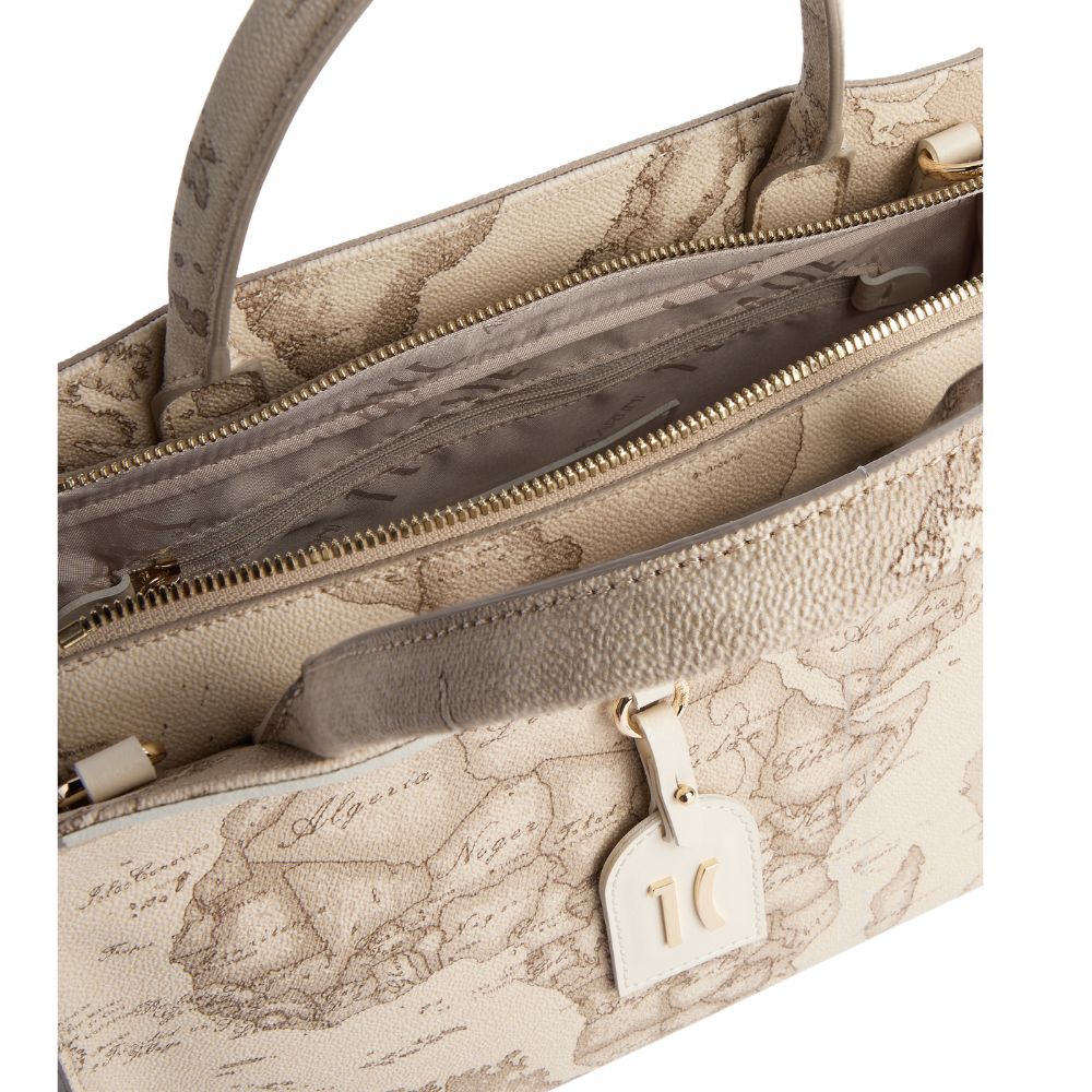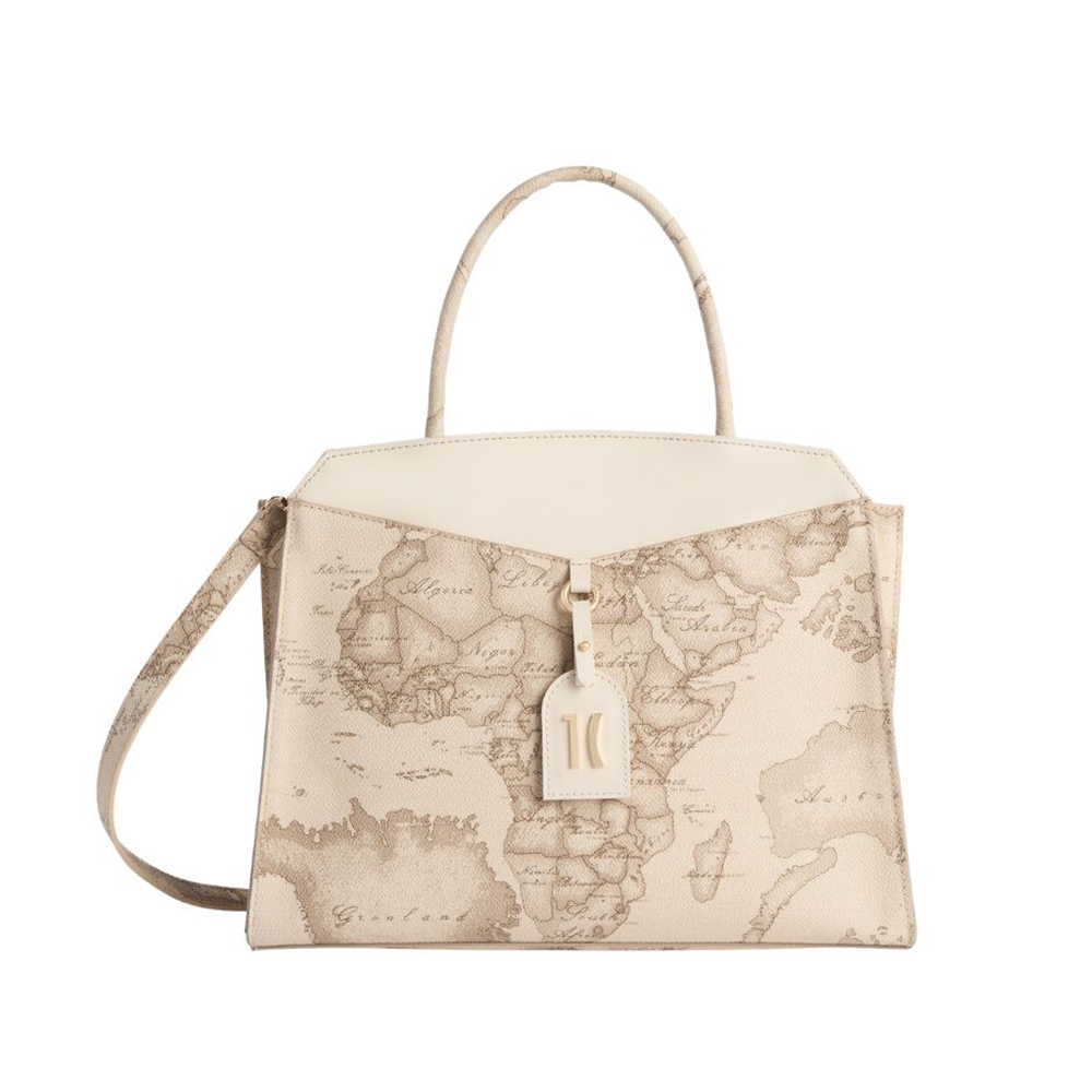 Der Stoff Geo Safari von Alviero Martini ist in eine strukturierte Handtasche mit gespannten Seiten und geformten Linien auf der Vorderseite für einen sauberen und minimalistischen Look modelliert. Der V-Einsatz aus glattem Leder in der Farbe Rafia endet auf dem Anhänger-Schild mit 1C-Logo in hellem Gold, das den Look animiert und die reisende Seele der Marke hervorruft. Groß und geräumig, bietet doppelte Portabilität dank der gefalteten Griffe und des verstellbaren und abnehmbaren Schultergurtes. Das Finish ist elegant und gleichzeitig lässig, perfekt für die Verzierung der Sommerlooks von neutral bis farbenfroher.