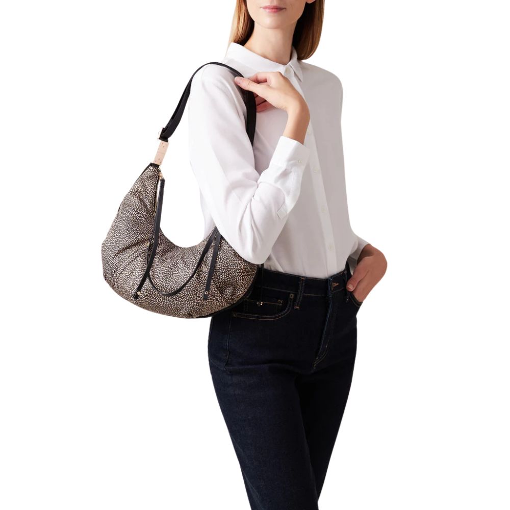 Die Tasche Hobo Cortina von Borbonese, ist die Linie, die einen der schönsten Orte in Italien feiert. Borbonese hat eine Hobo-Tasche geschaffen, die für ihre Eleganz und Originalität dank der charakteristischen doppelten Pence bekannt ist.
