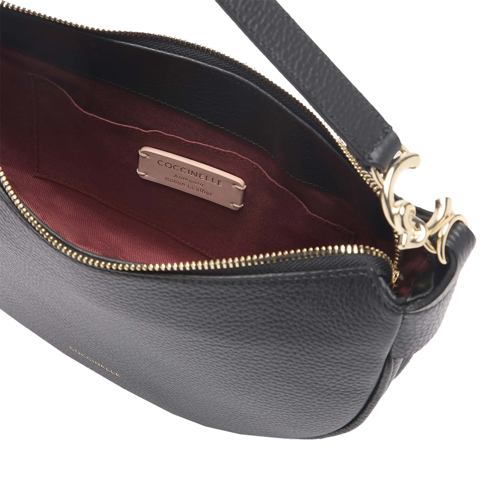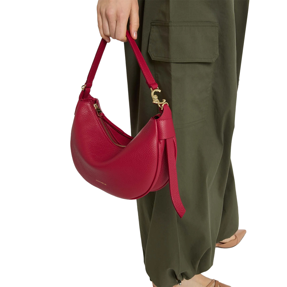 Die C-Easy Tasche von Coccinelle hat eine geschwungene Linie, die die Schönheit des Leders hervorhebt. Das Herzstück des Designs ist das metallische Detail am Griff, das neue C-Me-Logo. Diese Tasche zeichnet sich durch die Insellatura aus, die durch die Weichheit des Leders gegeben ist und ihr Vielseitigkeit und Haltung verleiht, während die seitlichen Lederbänder ein zusätzliches Detail der Weiblichkeit darstellen.