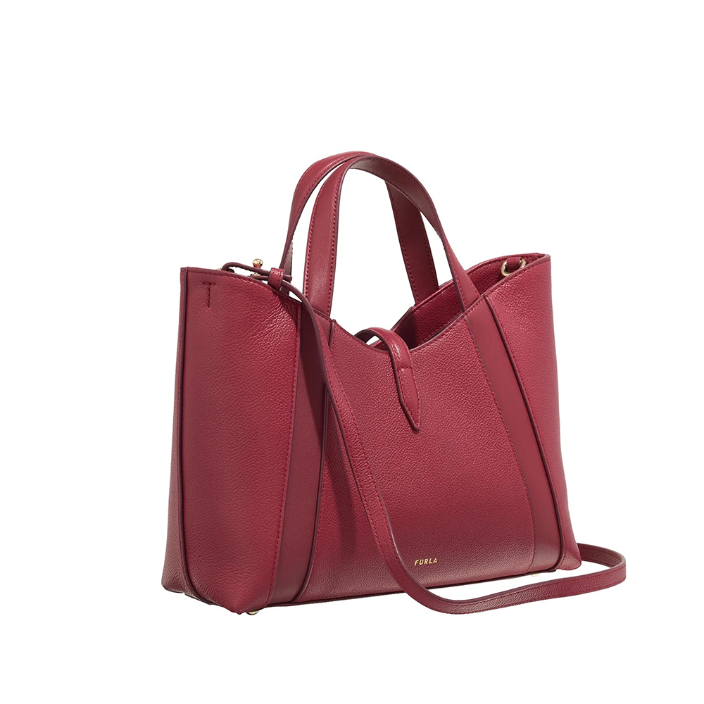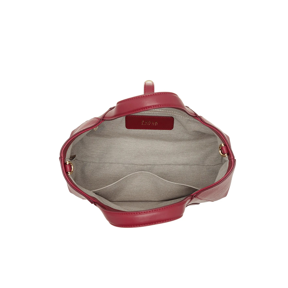 Die Tasche Drop von Furla aus hochwertigem Granatapfelleder schafft einen Kontrast mit den Details und den Doppelgriffen aus glattem Leder, die die Tasche definieren. Die weiche und unstrukturierte Silhouette wird durch einen Riemen bereichert, der mit neuer Hardware verziert ist, die mit dem ikonischen Logo Arco Furla dekoriert ist, das das Modell geschlossen hält.