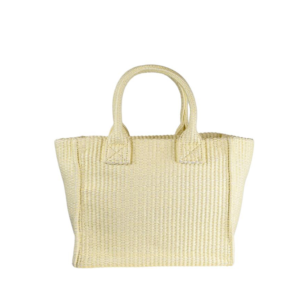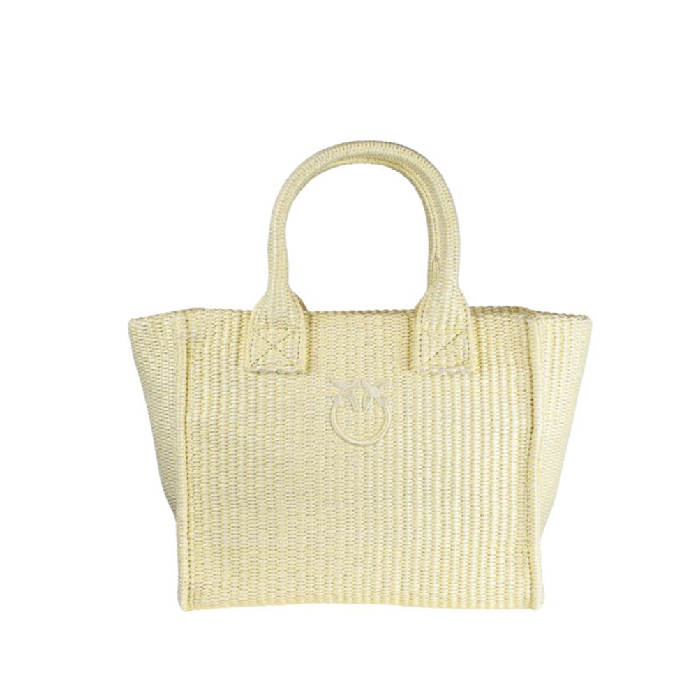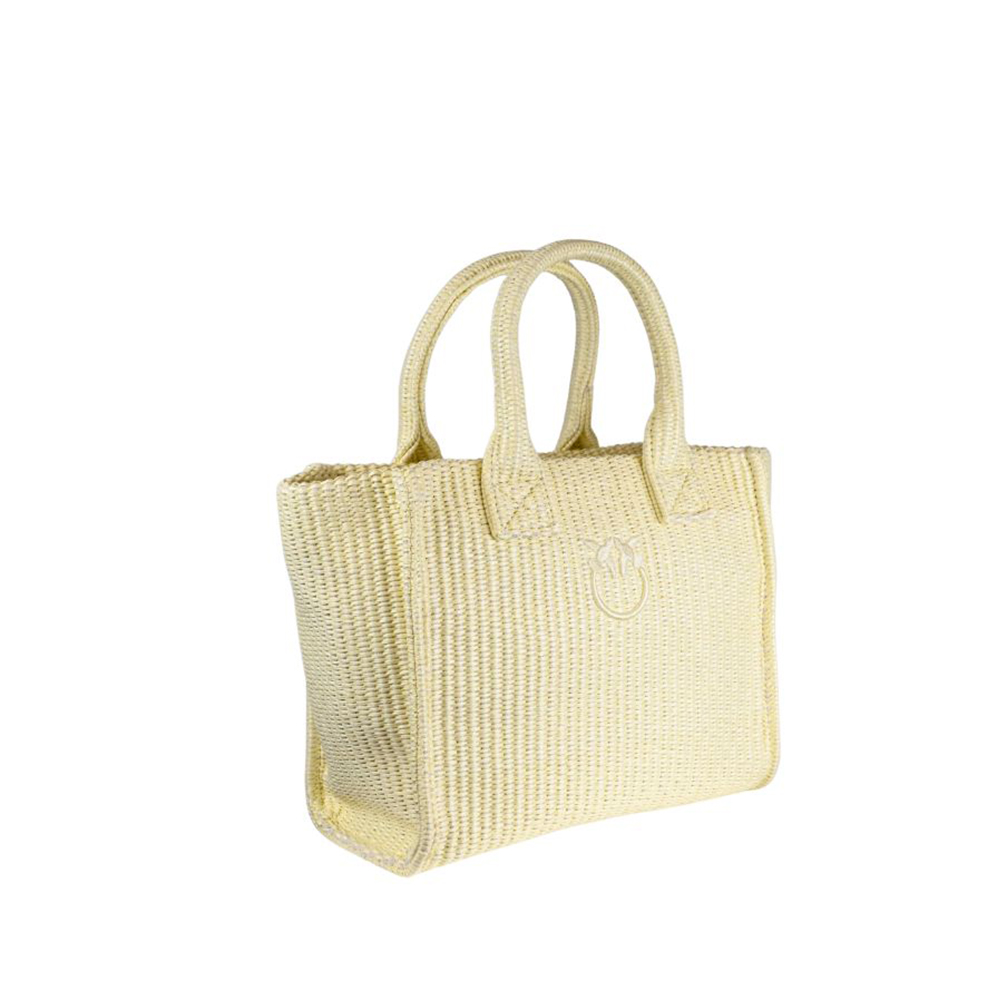 Einkaufstasche Beach Pinko mit leicht verlängerter rechteckiger Form, hergestellt aus Rafa und personalisiert mit dem PINKO-Logo gestickt in Ton auf der Vorderseite. Das Modell ist perfekt, um auch als Strandtasche am Strand getragen zu werden.