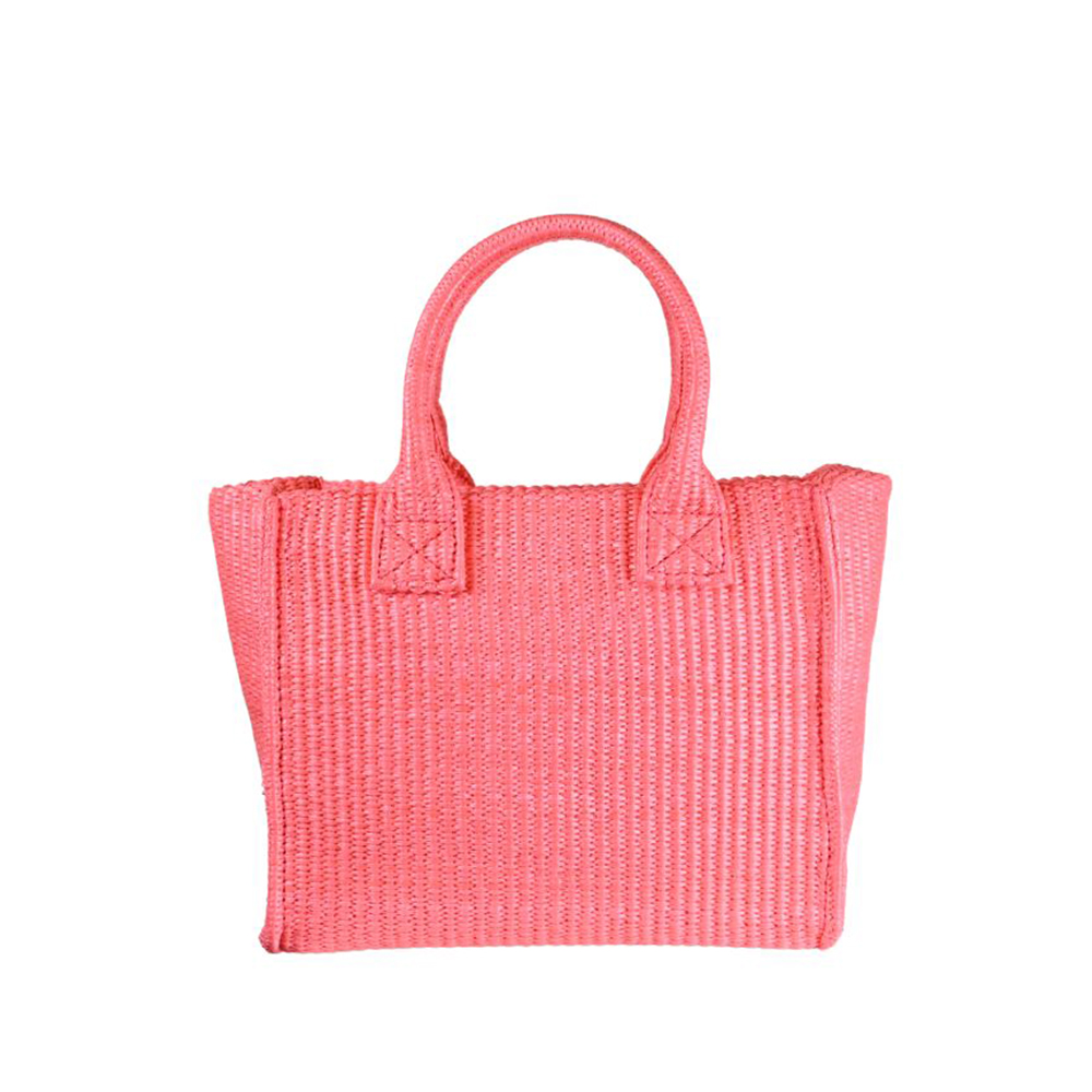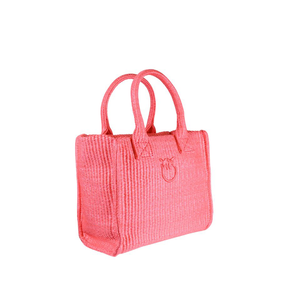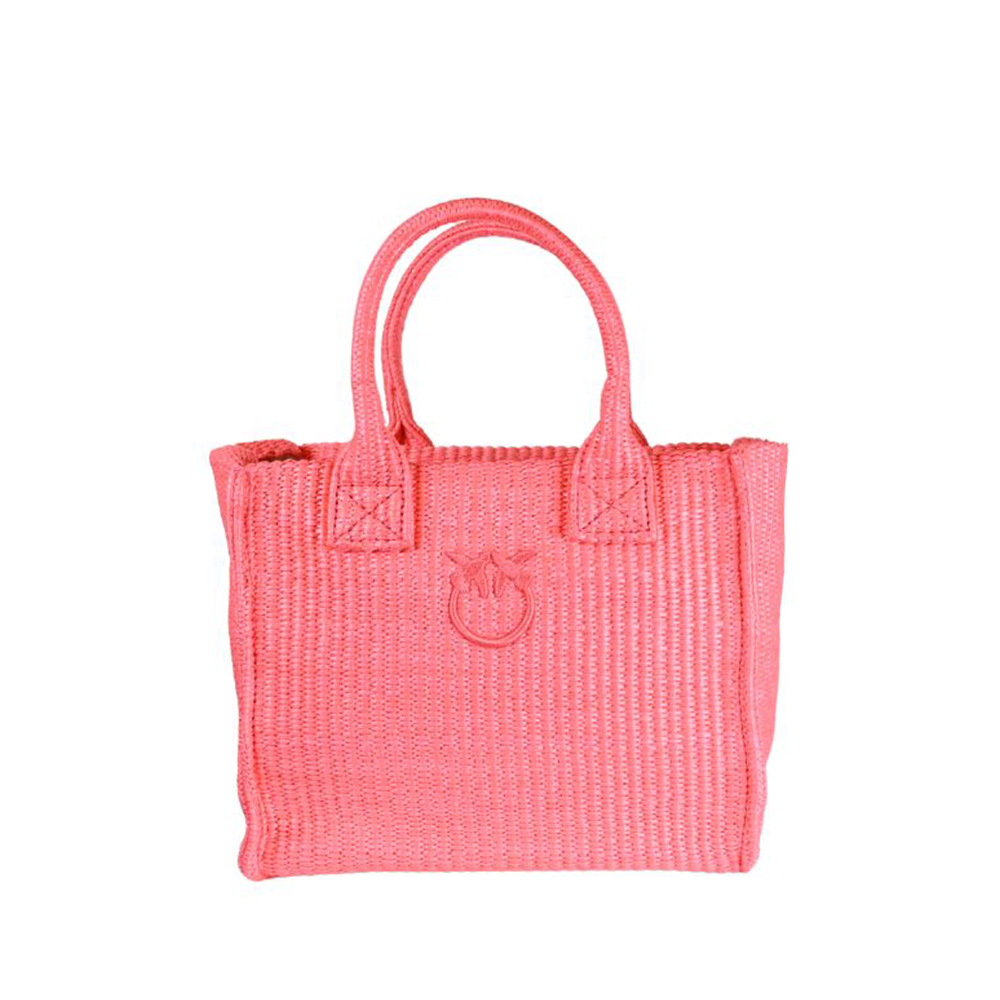 Einkaufstasche Beach Pinko mit leicht verlängerter rechteckiger Form, hergestellt aus Rafa und personalisiert mit dem PINKO-Logo gestickt in Ton auf der Vorderseite. Das Modell ist perfekt, um auch als Strandtasche am Strand getragen zu werden.