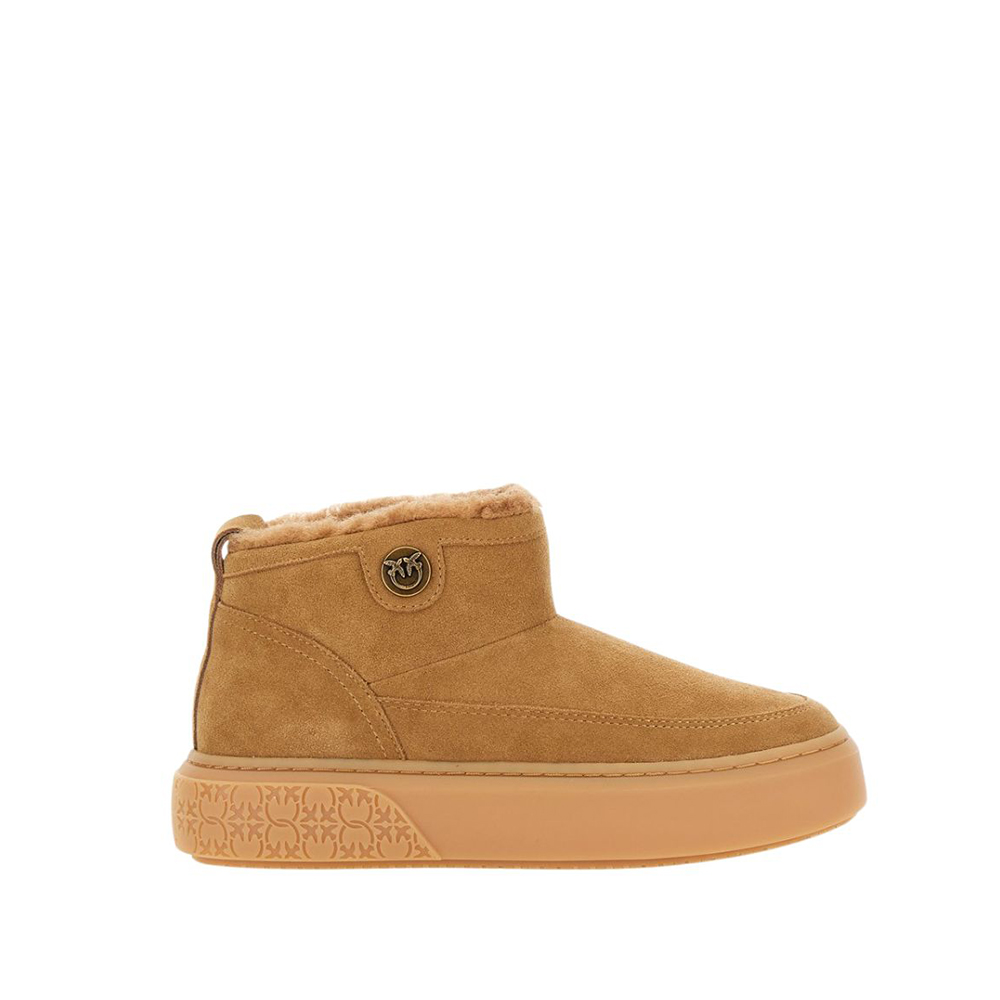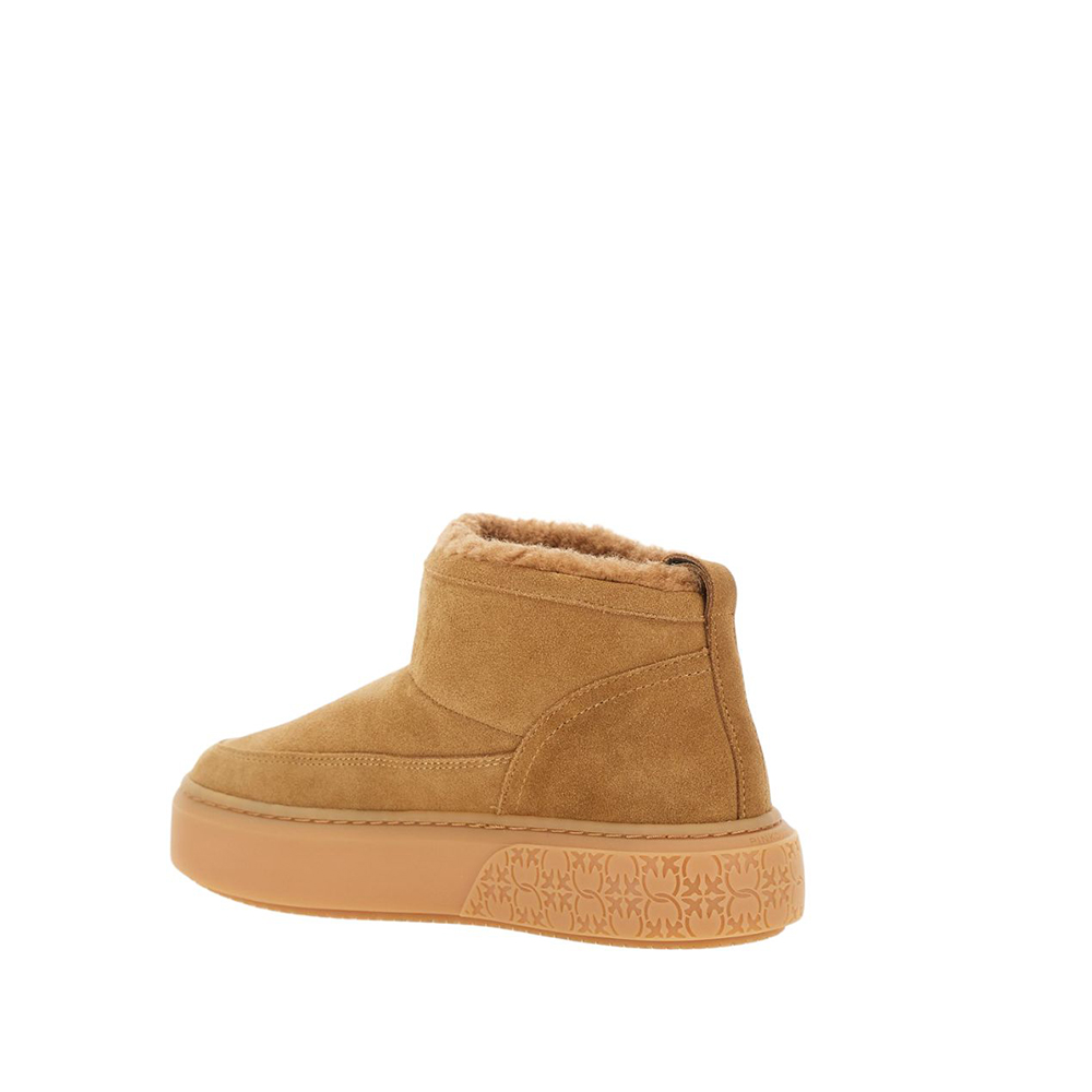 Die Stiefel Yoko von Pinko aus unifarbenem Veloursleder mit der ikonischen Metallschnalle. Die Innenseite aus Kunstfell und der gummierte Boden sind Ton in Ton. Passt zu jedem Outfit.