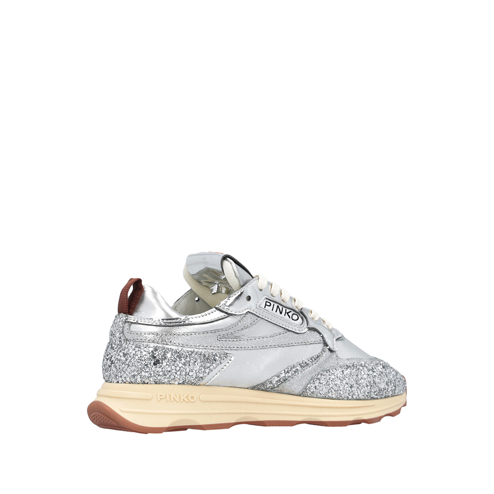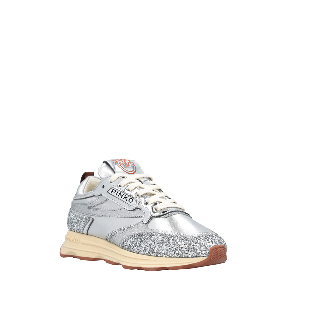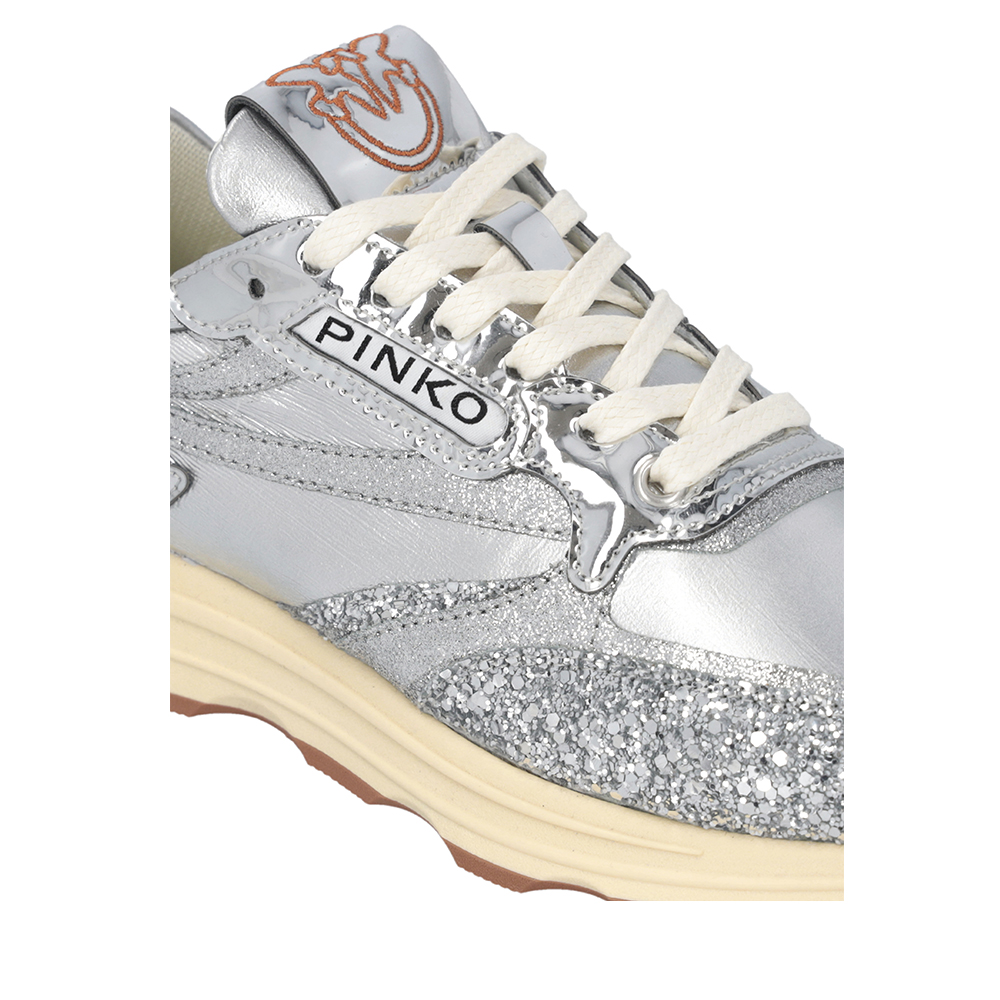 Die Zoe 03 Glitter Sneakers von Pinko aus Leder und Mesh mit silberfarbenen Glitzereinsätzen. Außensohle aus thermoplastischem Gummi, ein leichtes und widerstandsfähiges Material, Futter und Innensohle aus Textil.