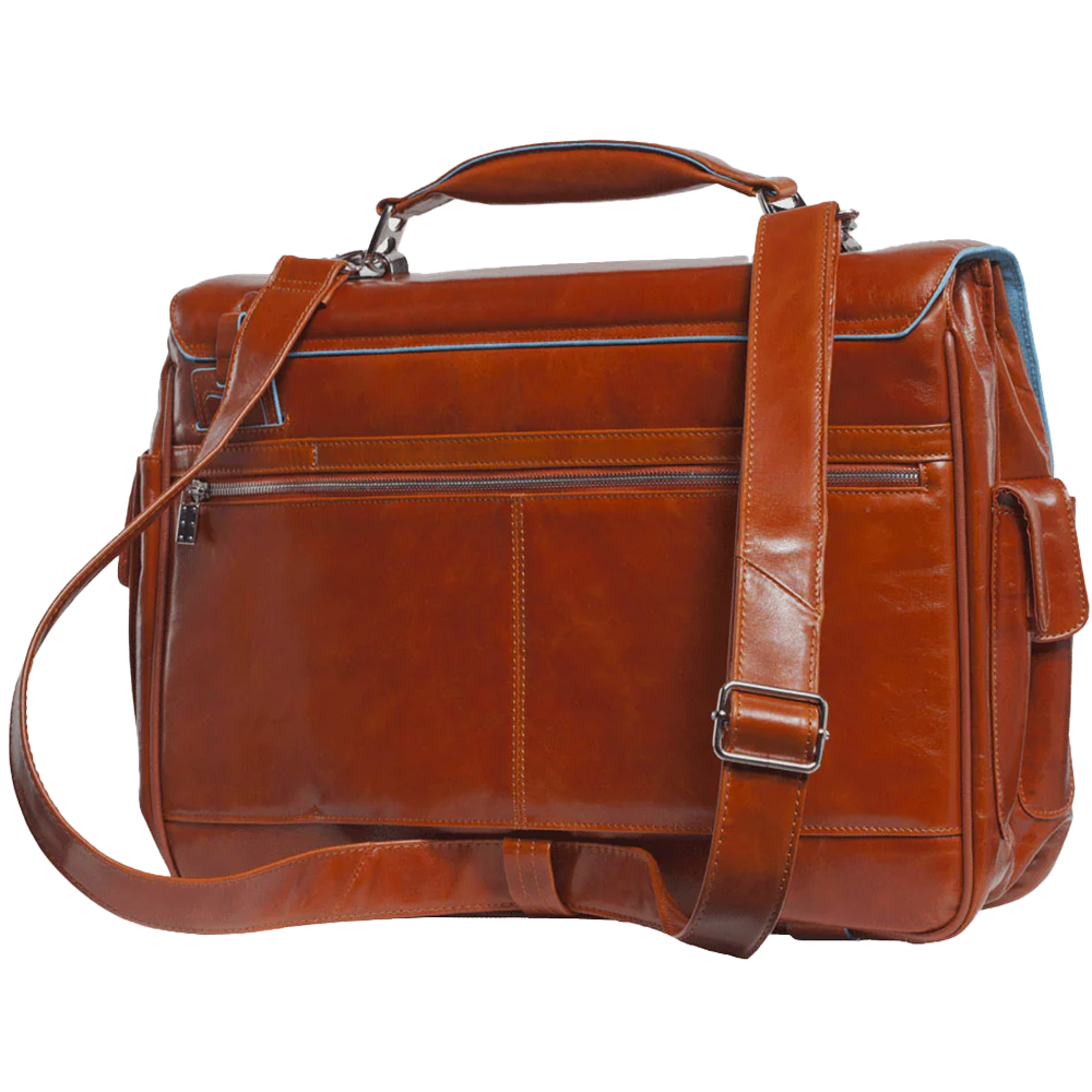 Blauer quadratischer Ordner von Piquadro für 15,6" und iPad Pro 12,9" Computer mit zwei Fronttaschen mit externem Stift- und Schirmhalter.