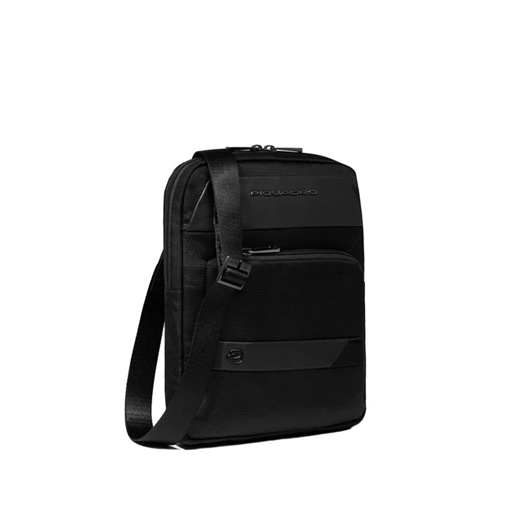 Herren-Umhängetasche für iPad von Piquadro mit Schultergurt aus recyceltem Stoff, mit Halterung für tragbares Fahrradlicht, RFID-Betrugsschutz und AirPods-Tasche.