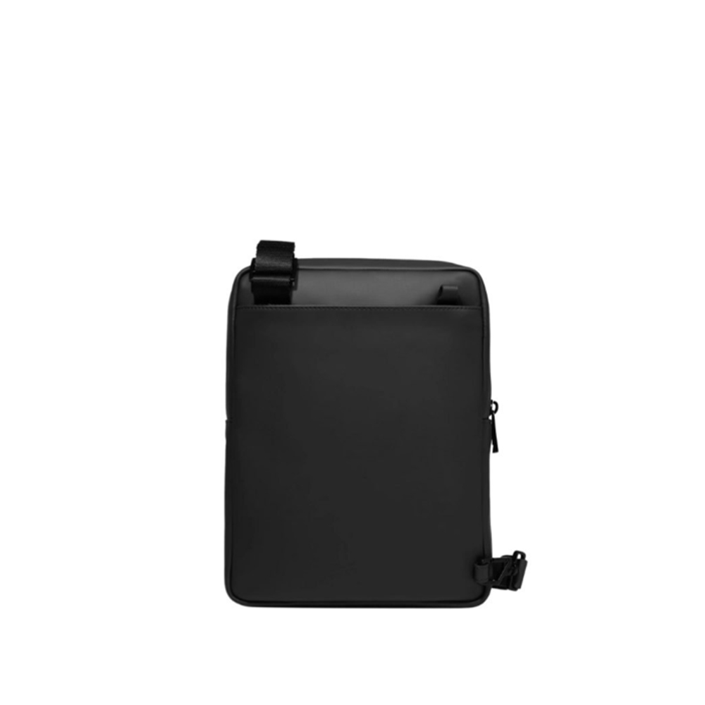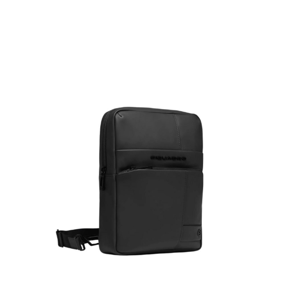 Die Tasche von Piquadro ist aus gummiertem Stoff, mit Taschen für AirPods. Vordere und hintere Tasche geschlossen mit Reißverschluss, Hauptfach mit Reißverschluss.
