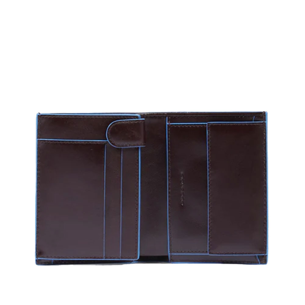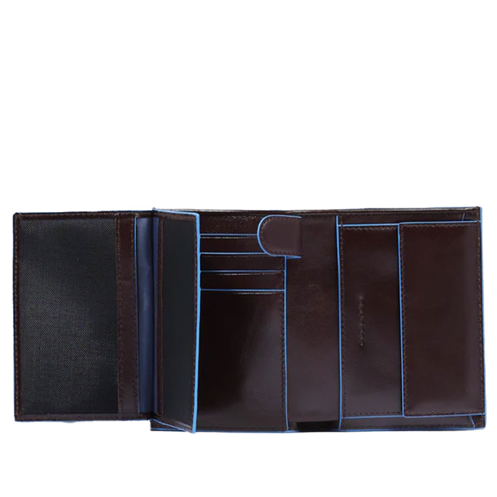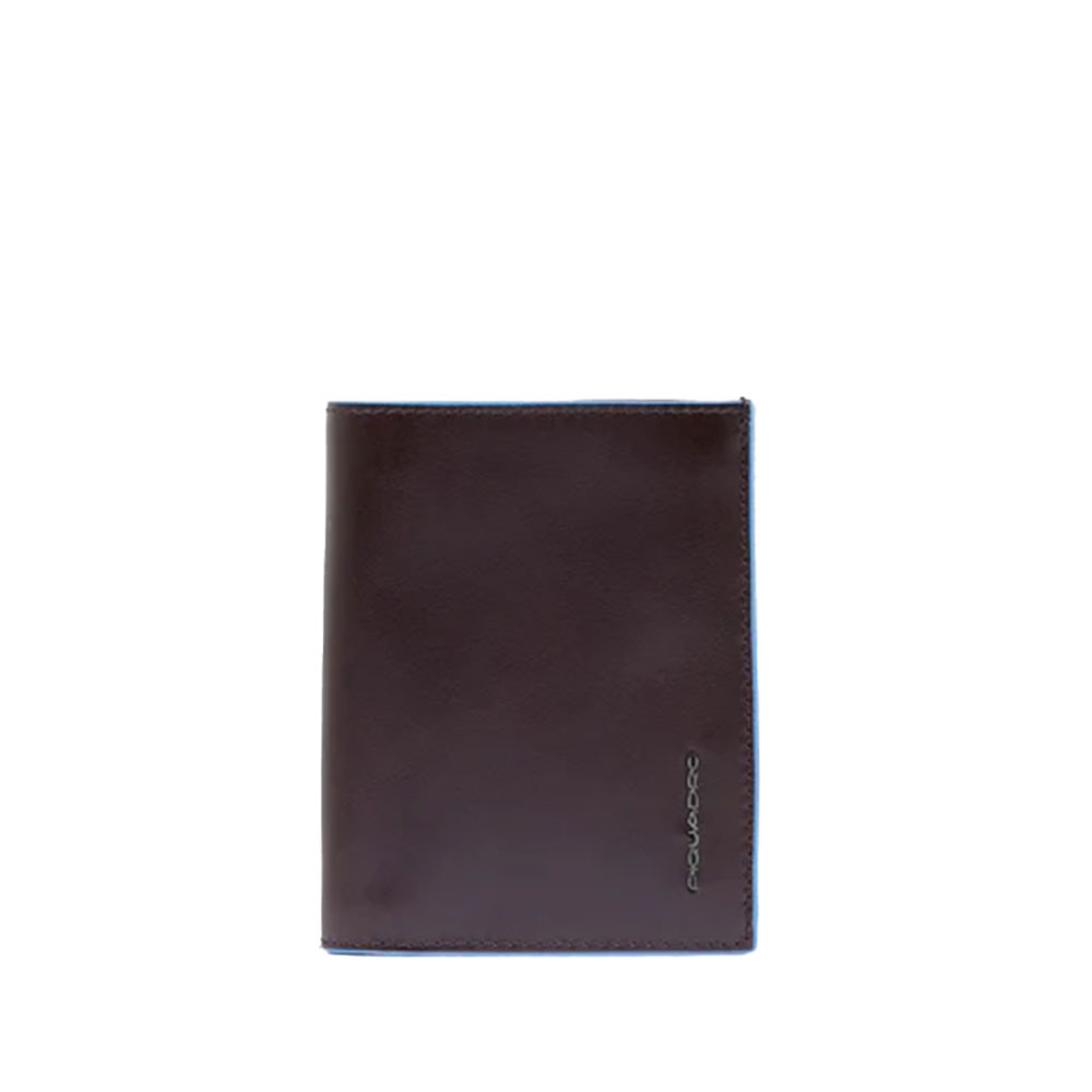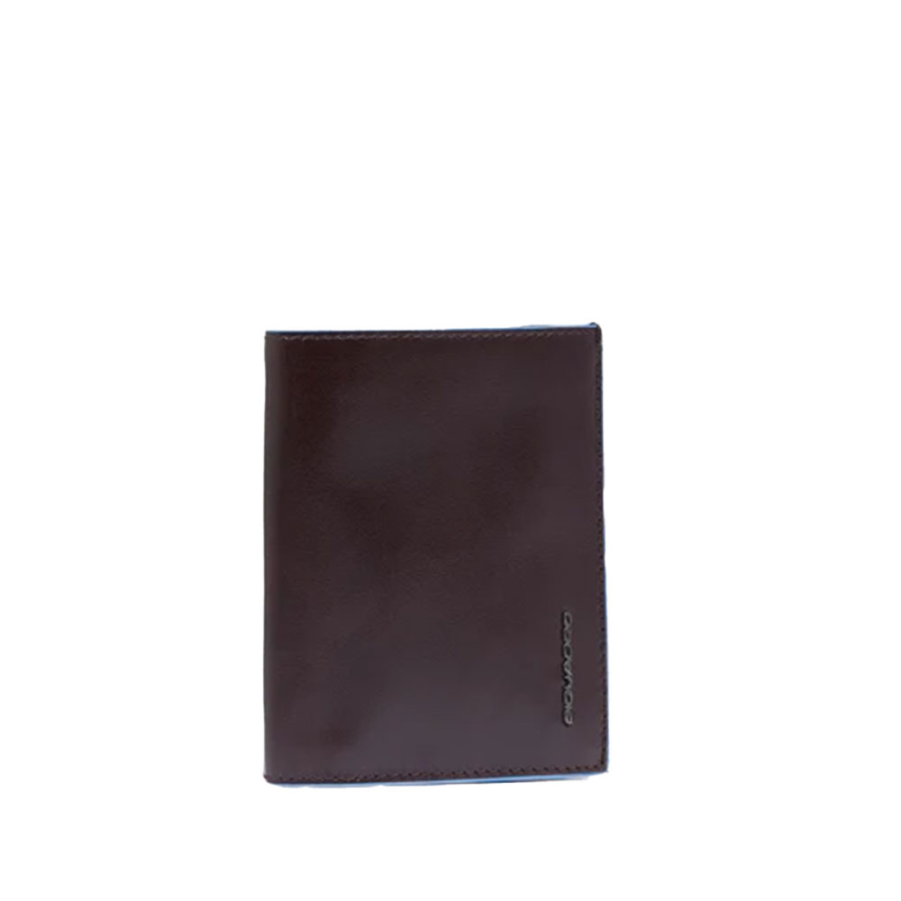 Portemonnaie für Herren aus Leder von Piquadro mit Geldbörse, Kreditkartenetui und zwei Handzettel, abgeschirmt mit RFID-Schutz.