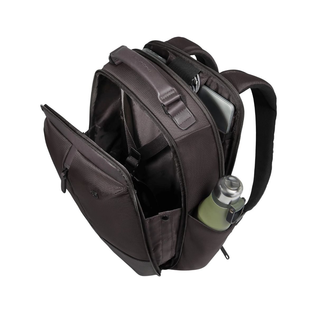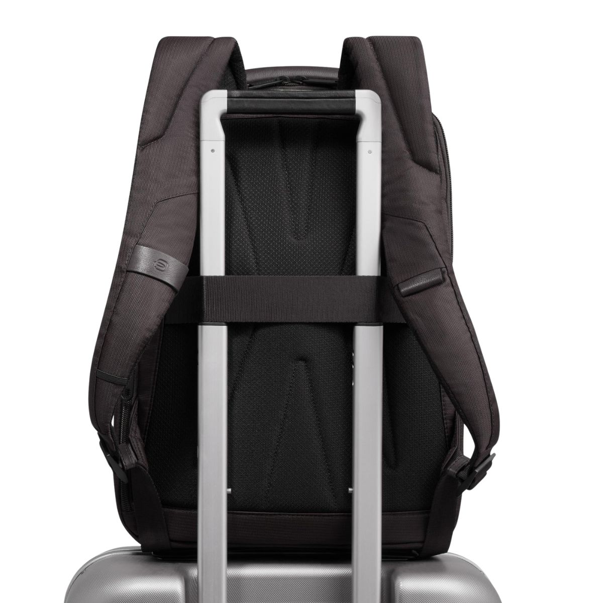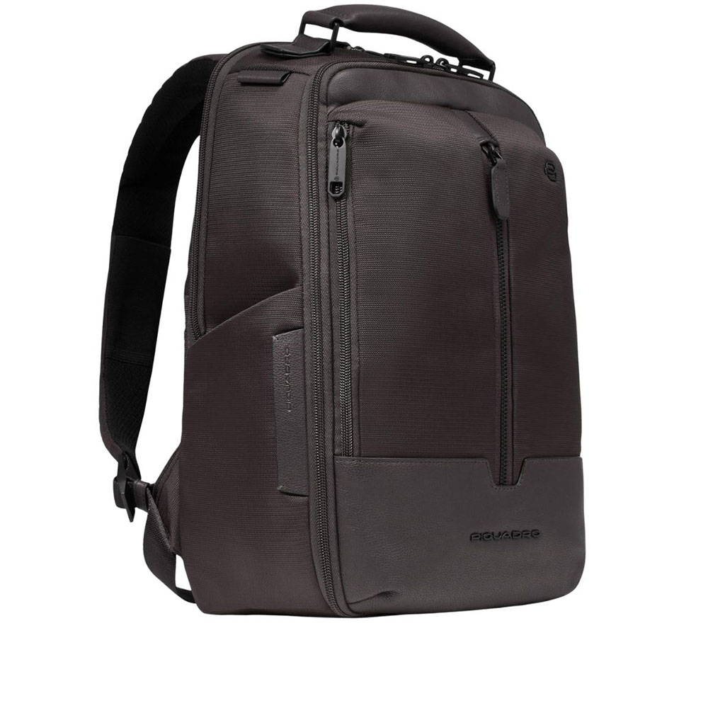 Reiserucksack von Piquadro aus recyceltem Stoff und Leder für PC und iPad mit Aufprallschutz und RFID.