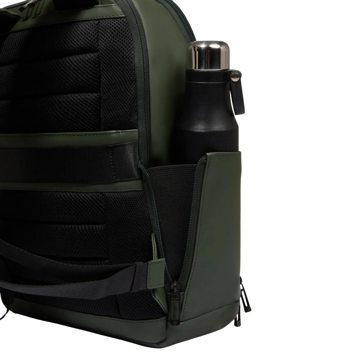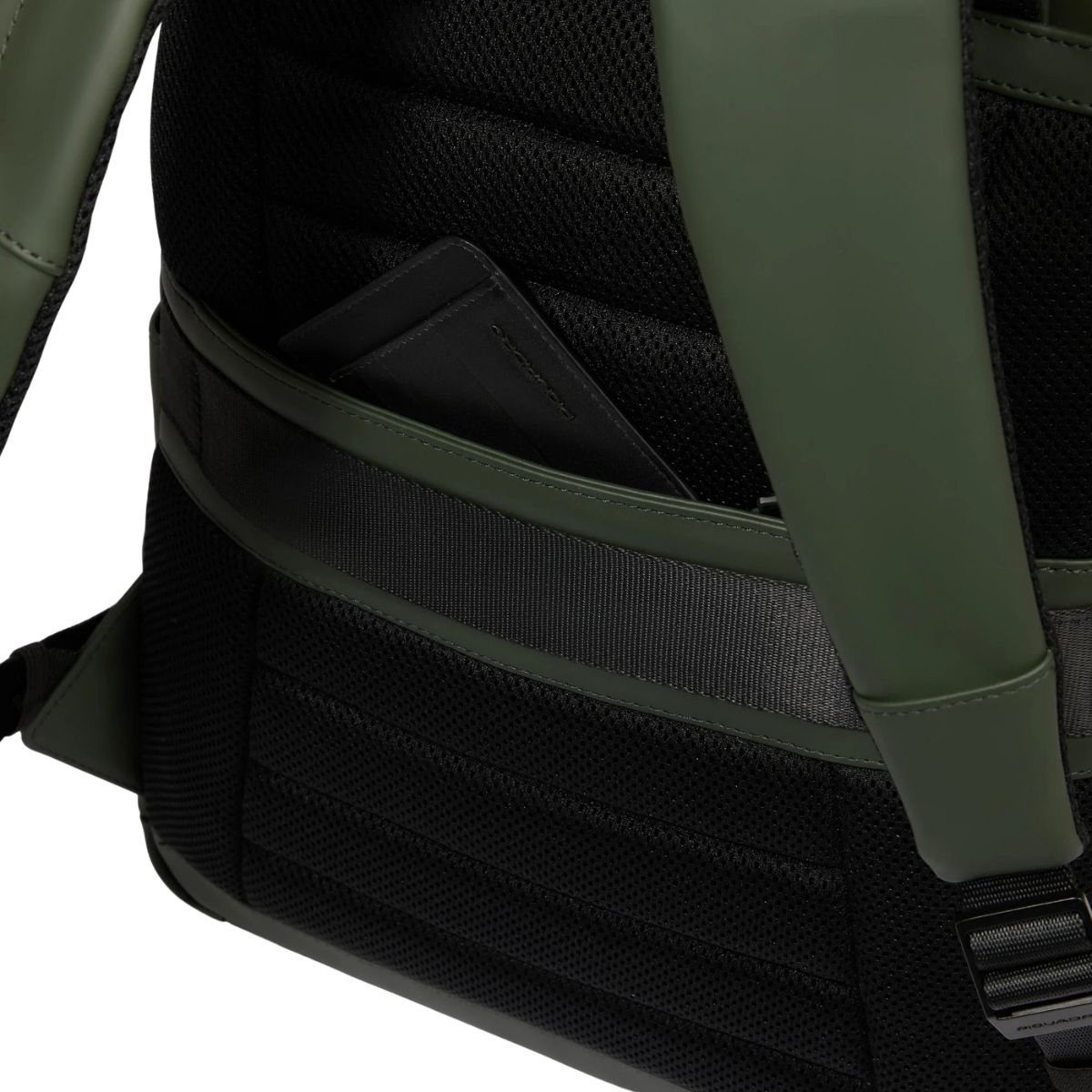 Rucksack für Herren mit PC und iPad von Piquadro aus gummiertem, wasserbeständigem Stoff mit Tasche für AirPods, Stoßschutz und RFID.