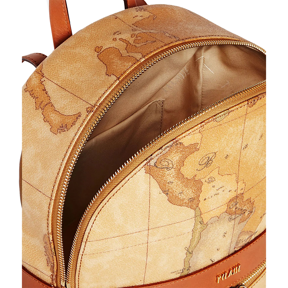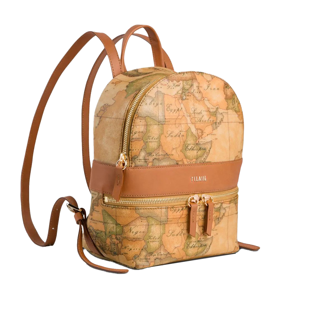 The Alviero Martini backpack in Geo Classic printed fabric features a front pocket and a gold-tone metal 1A Classe lettering logo.
