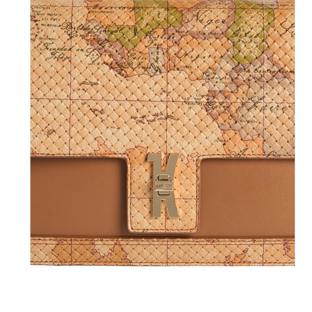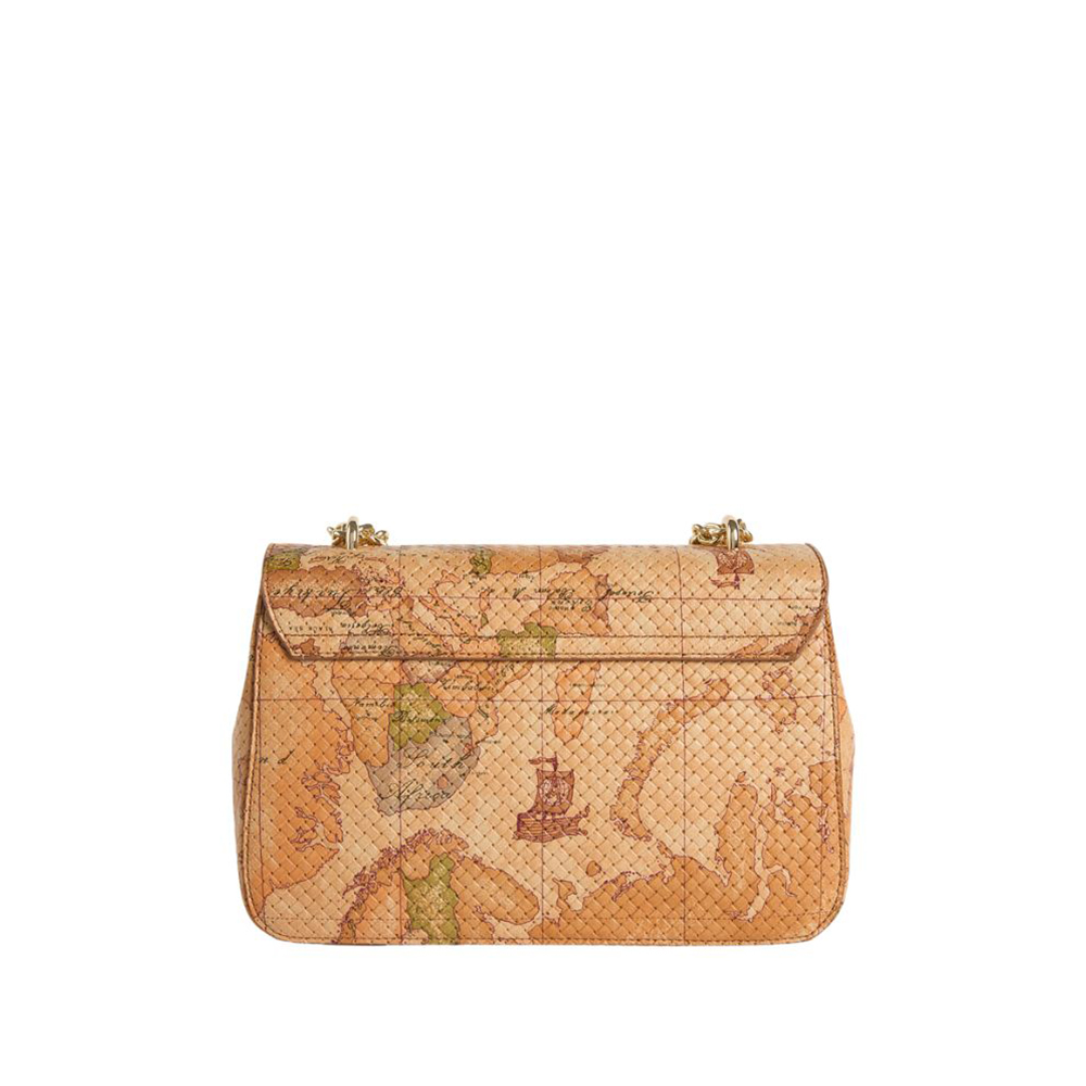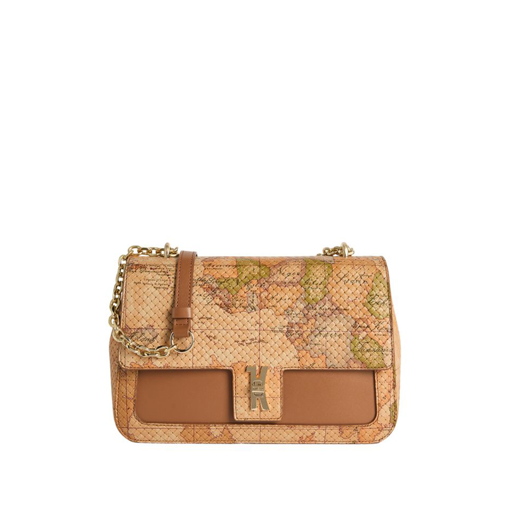 The Bay Lock Bag shoulder strap by Alviero Martini is luxurious and iconic in its Geo Classic print tassel version with woven impression, paired with smooth leather details in Cuoio for a light summer look. The soft sides match the clean lines of the flap, shaped to accommodate the 1C maxi logo closure and 1A Class logo walker. The light gold chain sliding shoulder strap helps enhance the look, offering crossbody and undershoulder portability. An impactful model that enhances any look, from the most minimal to the most sought-after.