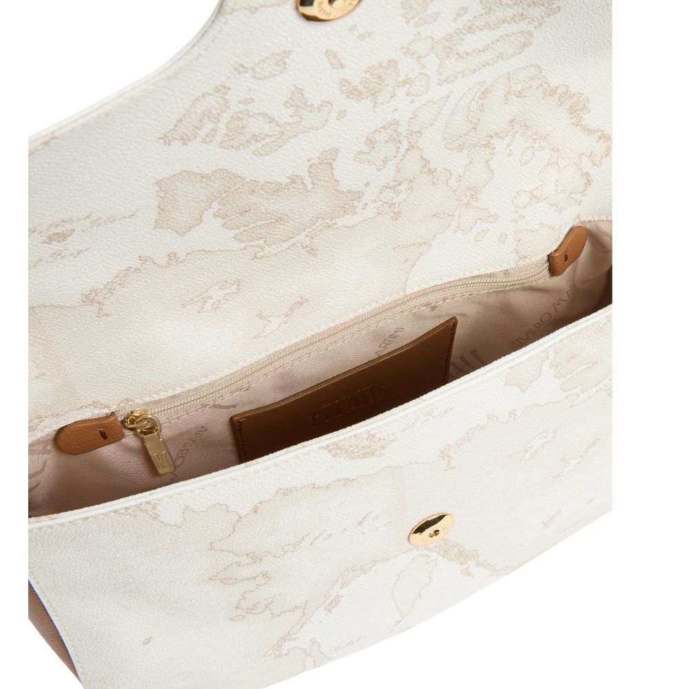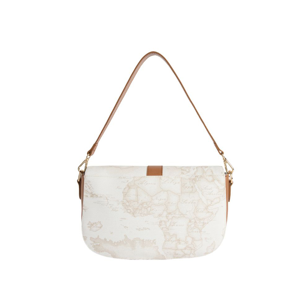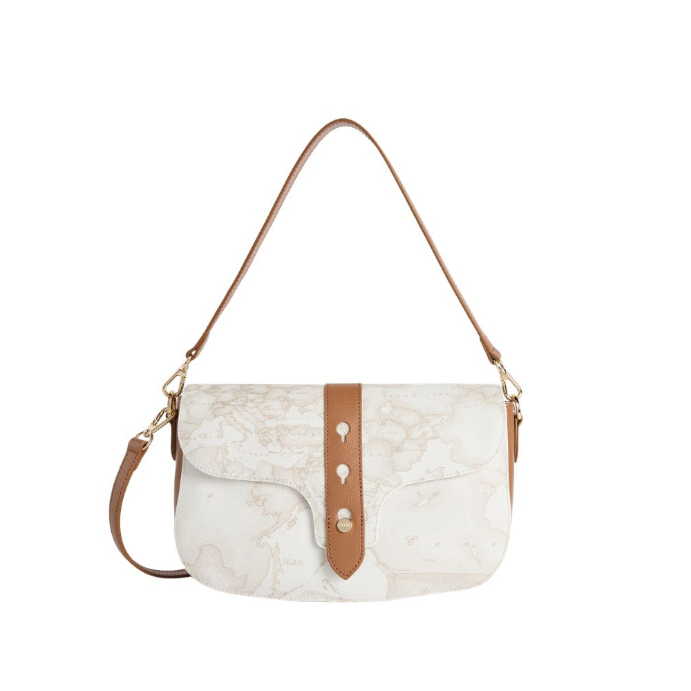 A true summer must-have, Alviero Martini's Escape Geo double-portable shoulder bag sports a captivating combination of Geo White fabric and fine leather details in Leather for a fresh, contrasting effect. The design is characterised by the flap shaped in rounded lines, enriched in the centre by the vertical list with 1ST Class logo stud. The wide hip makes it roomy, perfect for a variety of occasions: alternate the shoulder strap with the shoulder strap to suit any look, from shirts and jeans for an afternoon in the city to flowing dresses for a chic evening on the seafront.