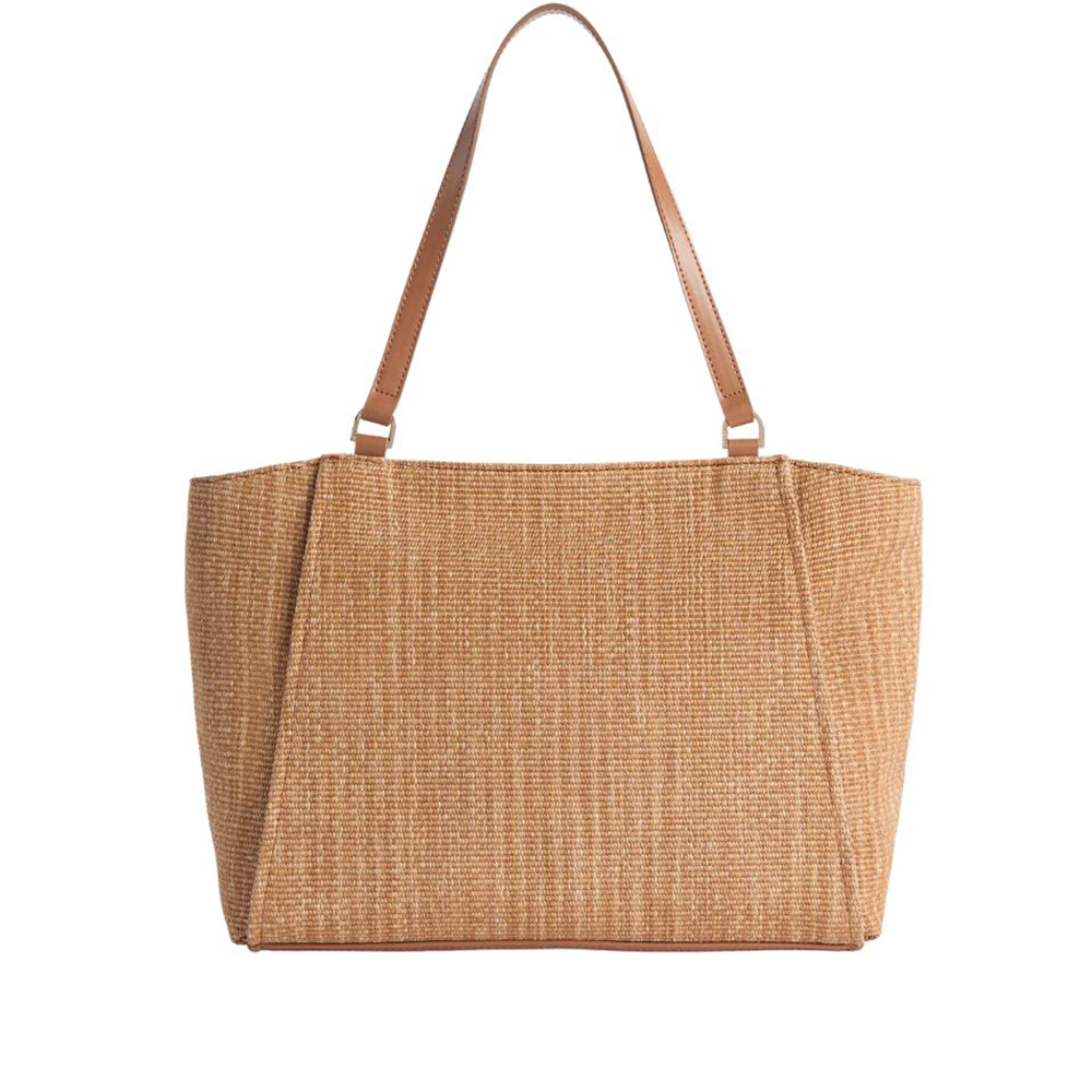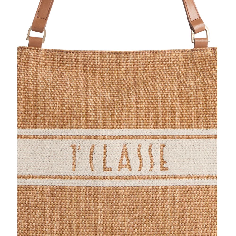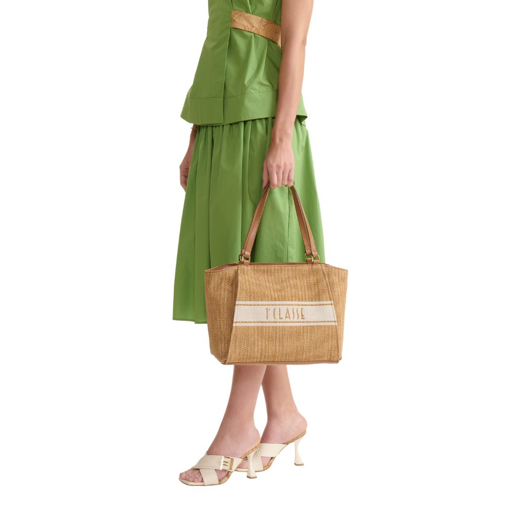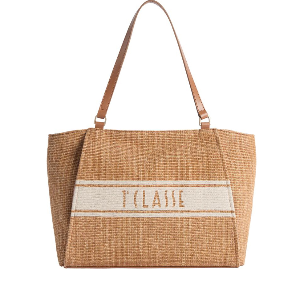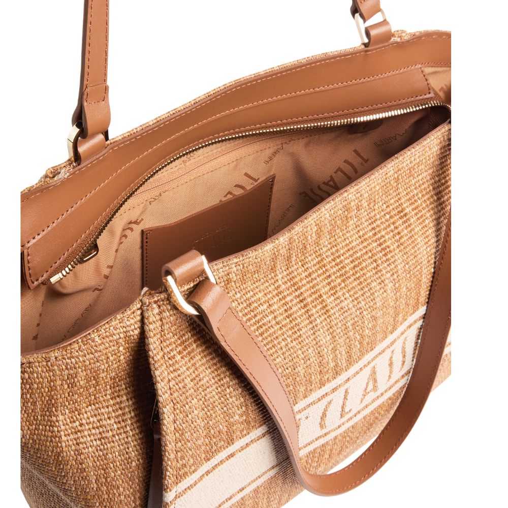 Crafted from raffia-effect fabric, Alviero Martini's Rafia Coast shopping bag is a new addition to the Collection that immediately becomes a must-have: the volume is soft yet structured, with rounded sides and a flat bottom finished with a smooth leather border. The slide roof and interior facings are also made of smooth leather in tone, while the front is characterised by two slanted zip pockets that delimit the contrasting printed band with the 1A Class logo. Informal and carefully crafted, it lends itself well to both office looks and holiday outfits, providing a classic touch thanks to the Leather color.
