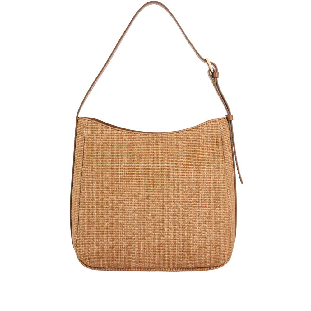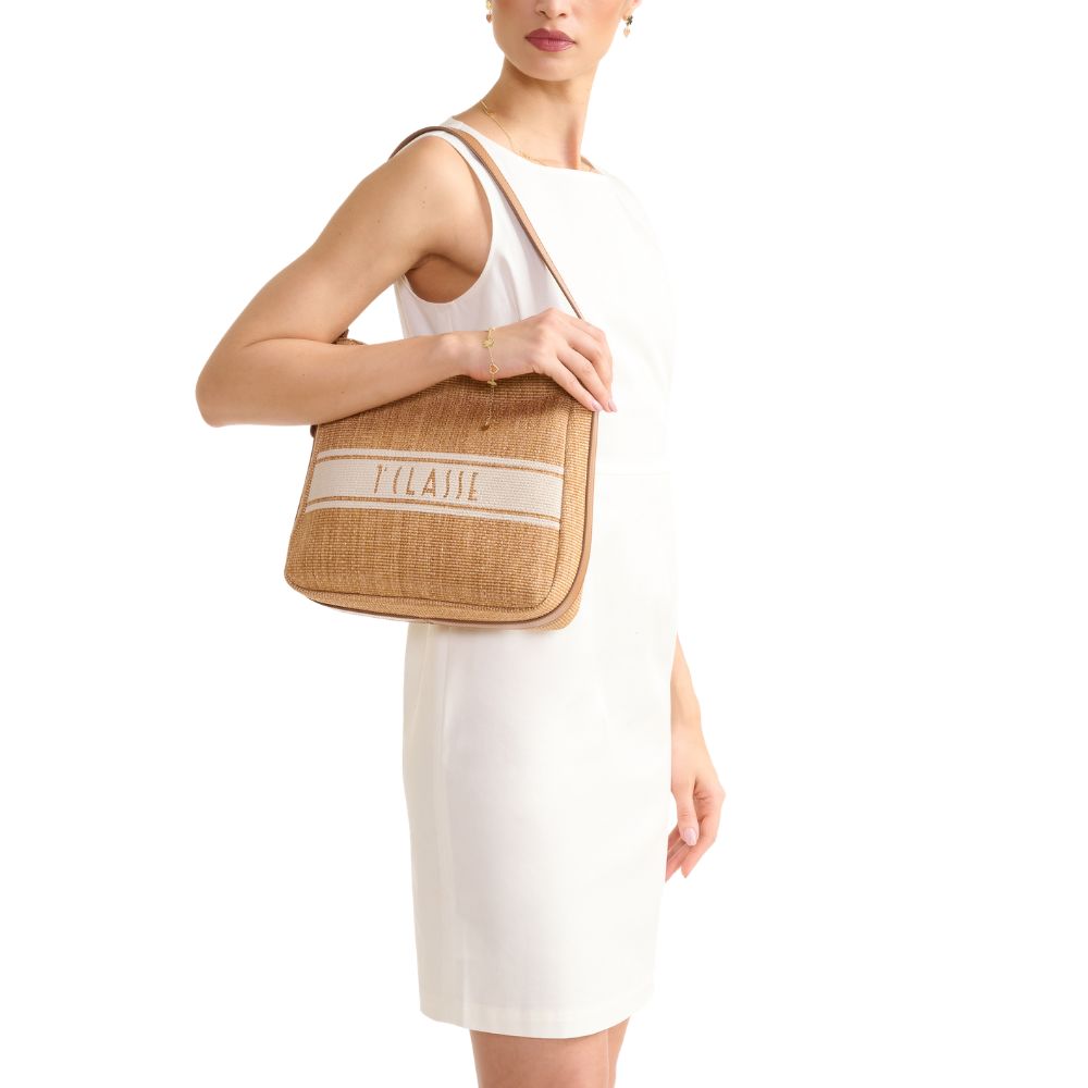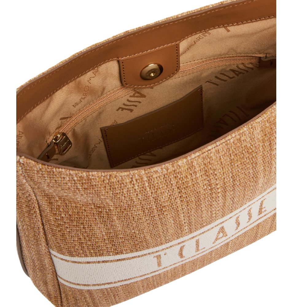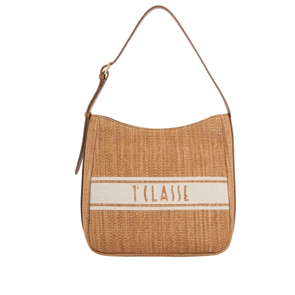 Crafted from raffia-effect fabric, Alviero Martini's Rafia Coast shopping bag is a new addition to the Collection that immediately becomes a must-have: the volume is soft yet structured, with rounded sides and a flat bottom finished with a smooth leather border. The slide roof and interior facings are also made of smooth leather in tone, while the front is characterised by two slanted zip pockets that delimit the contrasting printed band with the 1A Class logo. Informal and carefully crafted, it lends itself well to both office looks and holiday outfits, providing a classic touch thanks to the Leather color.