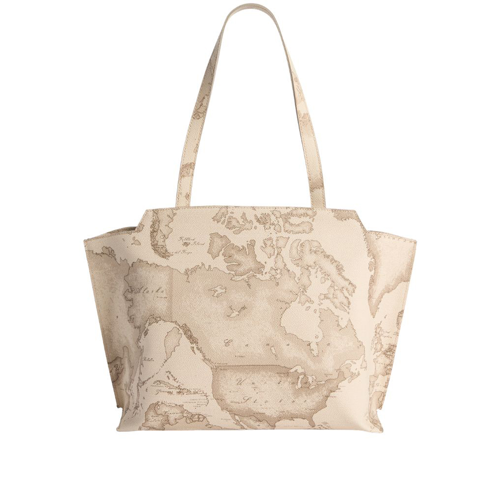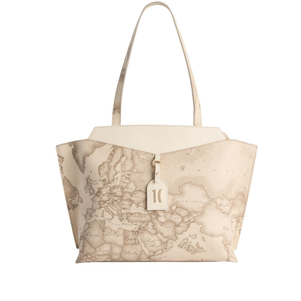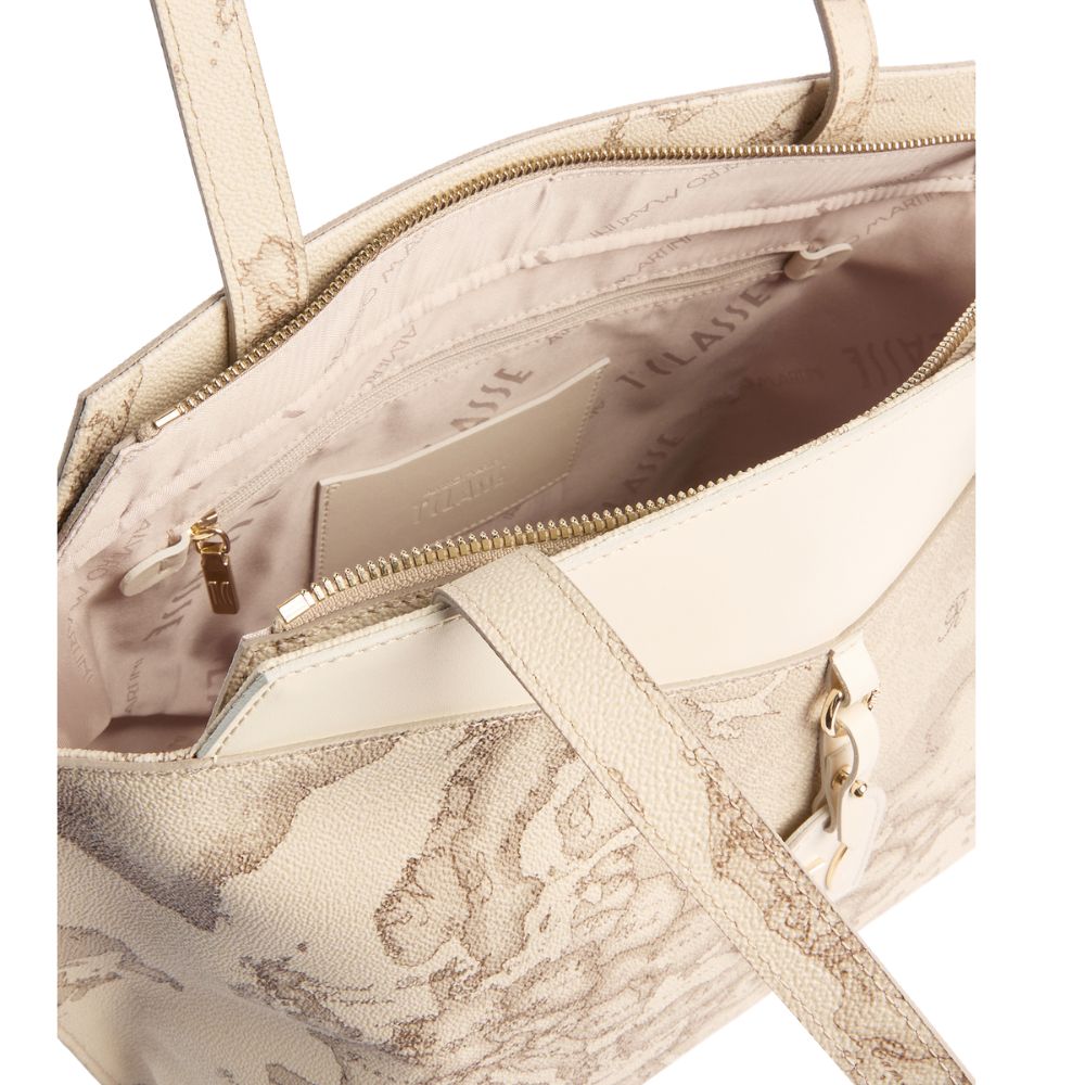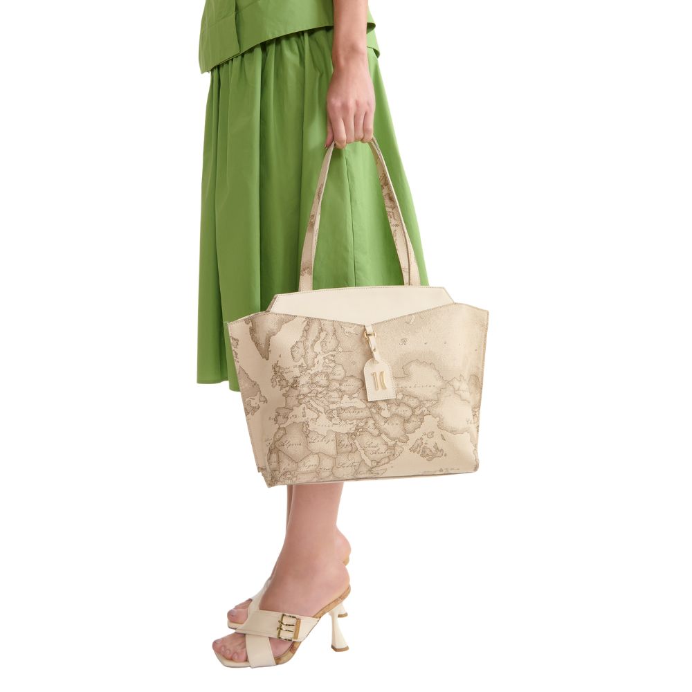 Alviero Martini's Linea Rituals Geo Safari interprets the shopping bag with an elegant and structured design: the sides are folded and stapled outwards, while the smooth V-shaped leather insert ends in the hanging tag with the 1C logo in light gold. Geo Safari fabric gives her a versatile and recognizable look that pairs perfectly with summer outfits, from neutrals to more colorful ones: roomy and distinctive, she is the style ally for your daily rituals.