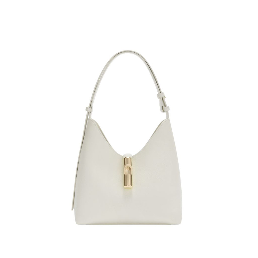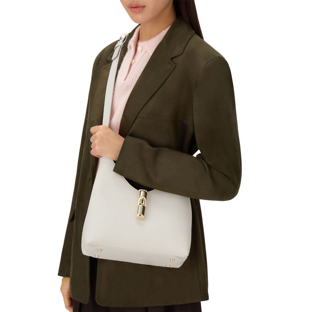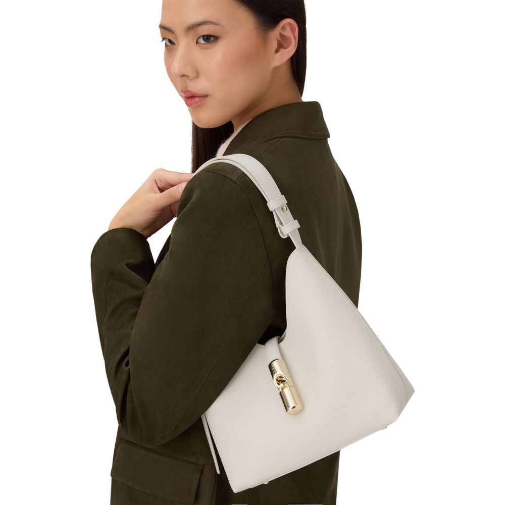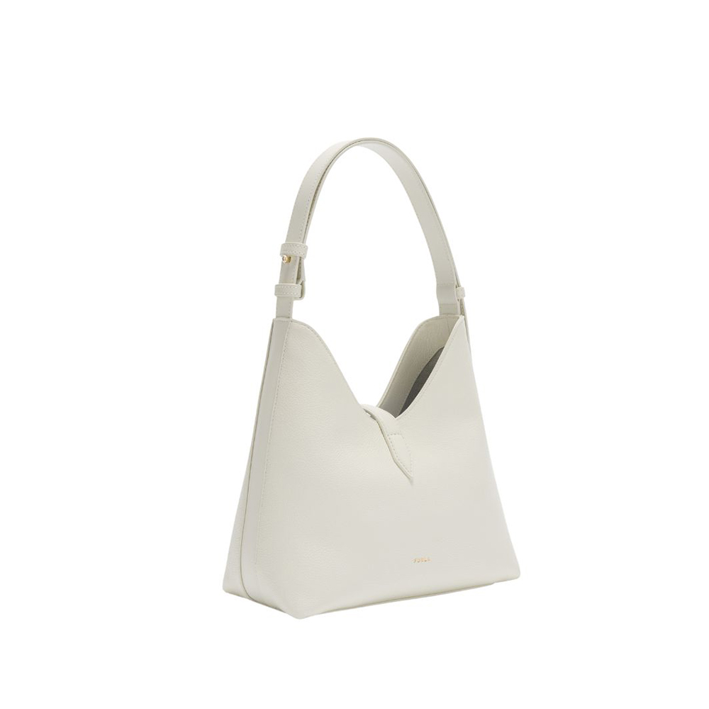 Furla's Goccia shoulder bag stands out for its soft, unstructured silhouette made of smooth leather and printed calfskin. The bag is enhanced by a zip tie combined with the adjustable contrasting leather handle. The new cyclindric hardware with pesetto and Arco Furla logo elegantly closes the model.