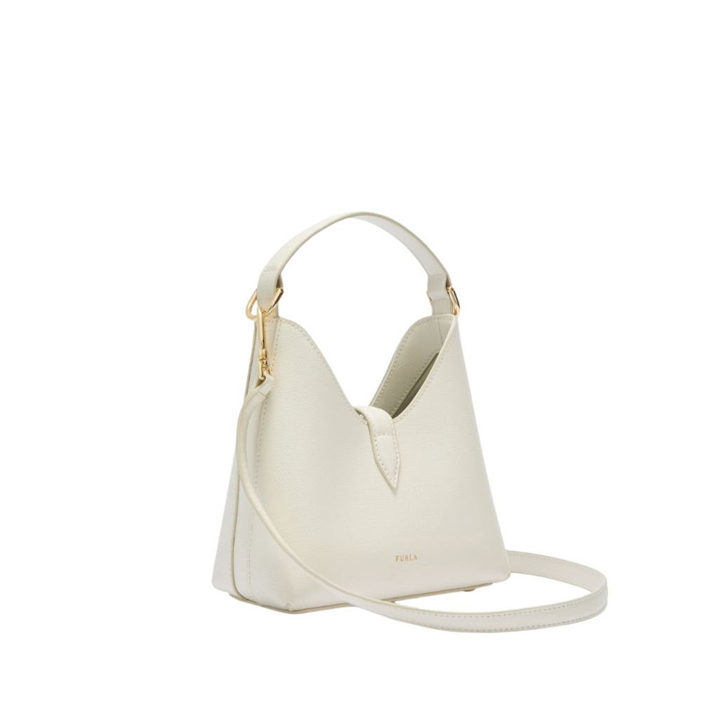Furla's Iride mini bag stands out for its soft A-line silhouette made of printed leather. The bag is enhanced by a matching zip tie embellished with new cyclindric hardware decorated with the iconic Arco Furla logo. The open interior is compact to accommodate its own essentials. A versatile bag, perfect for any occasion of use, to be worn both in top handle and shoulder versions thanks to the adjustable and removable shoulder strap provided.