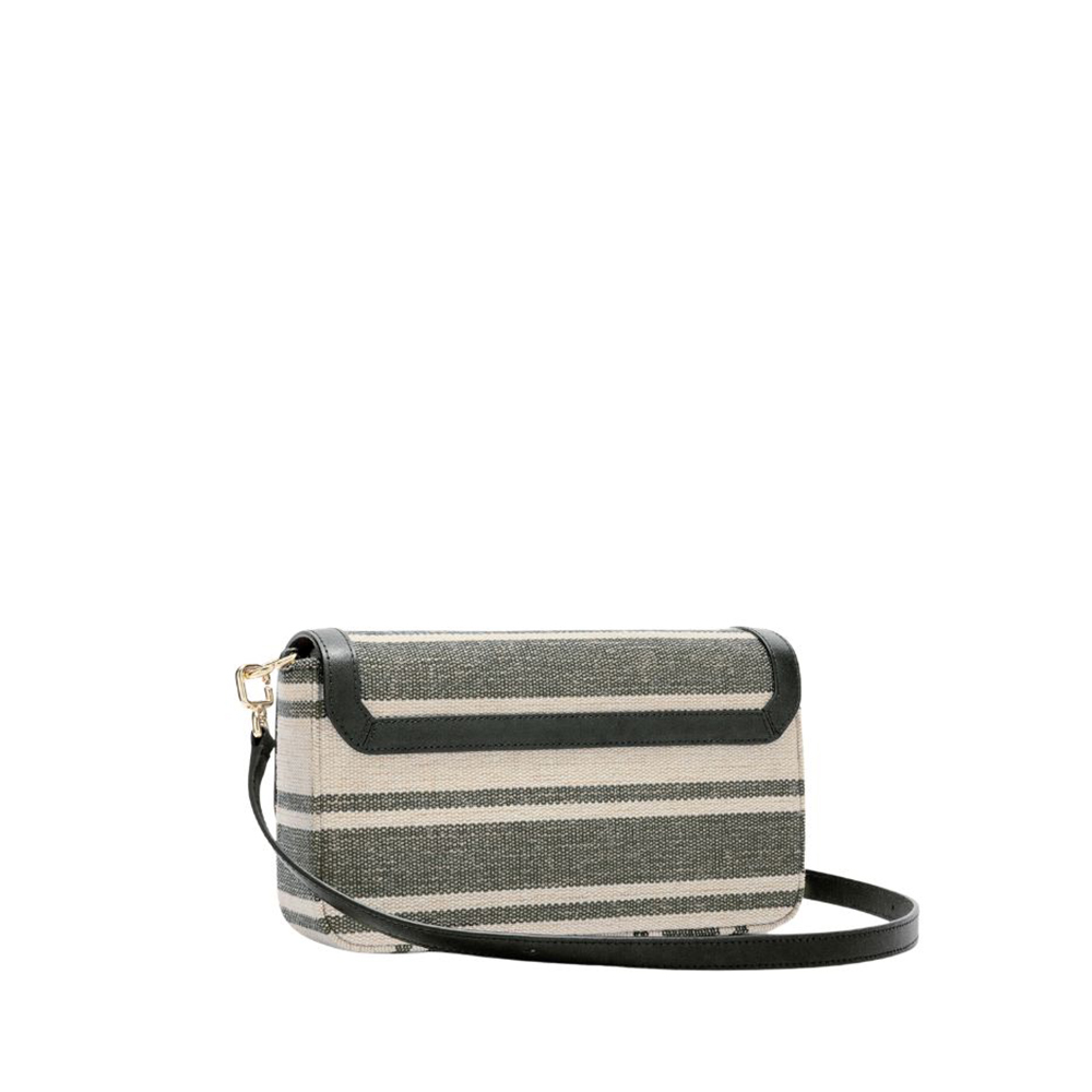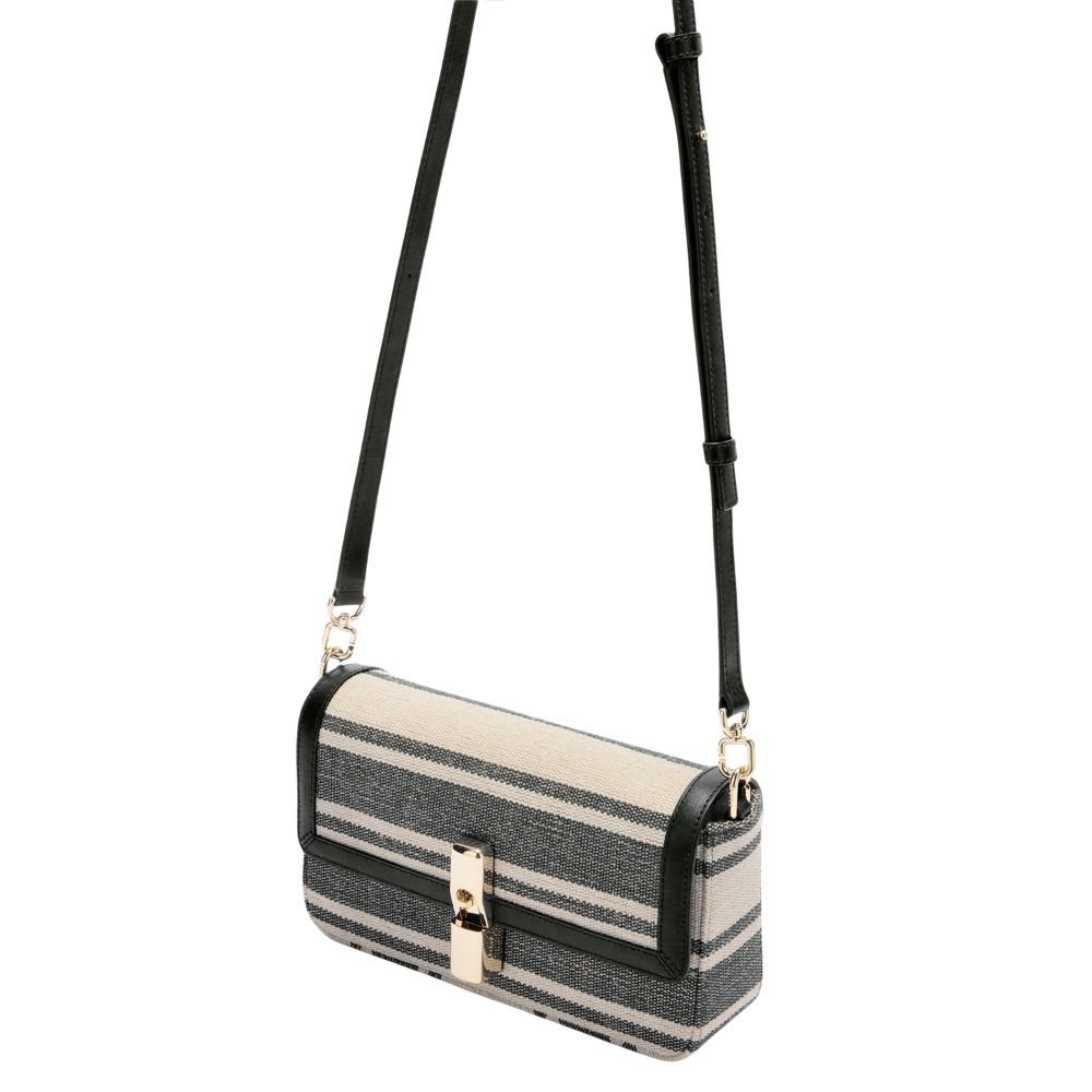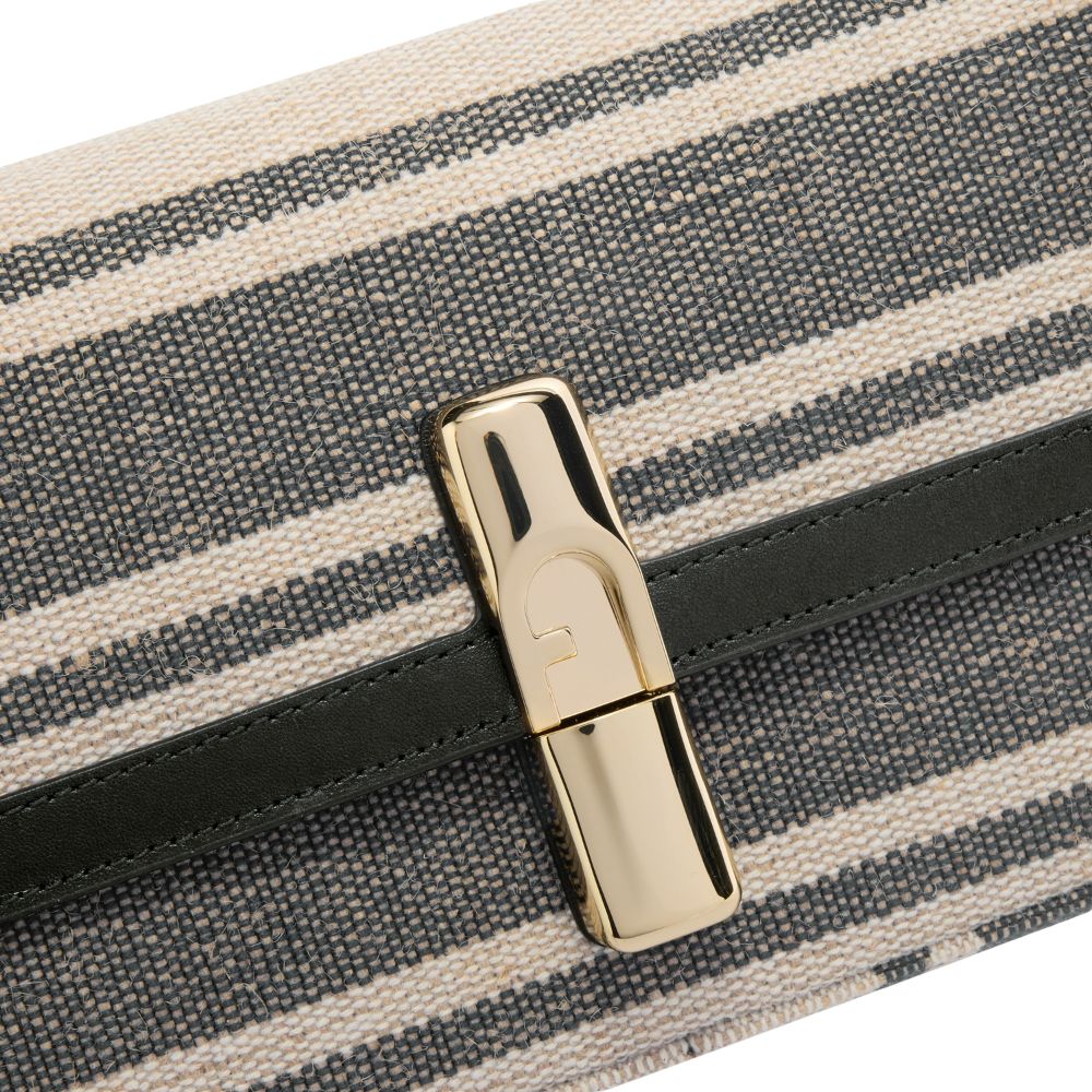Furla's Iride shoulder bag features a versatile and contemporary design. The body of the compact size bag is made of canvas with striped design, finished with elegant and fine smooth leather details. Accompanied by the adjustable and removable shoulder strap, it features a magnetic closure embellished with cylindrical metal hardware with the iconic Arco Furla logo.