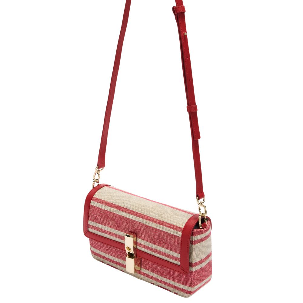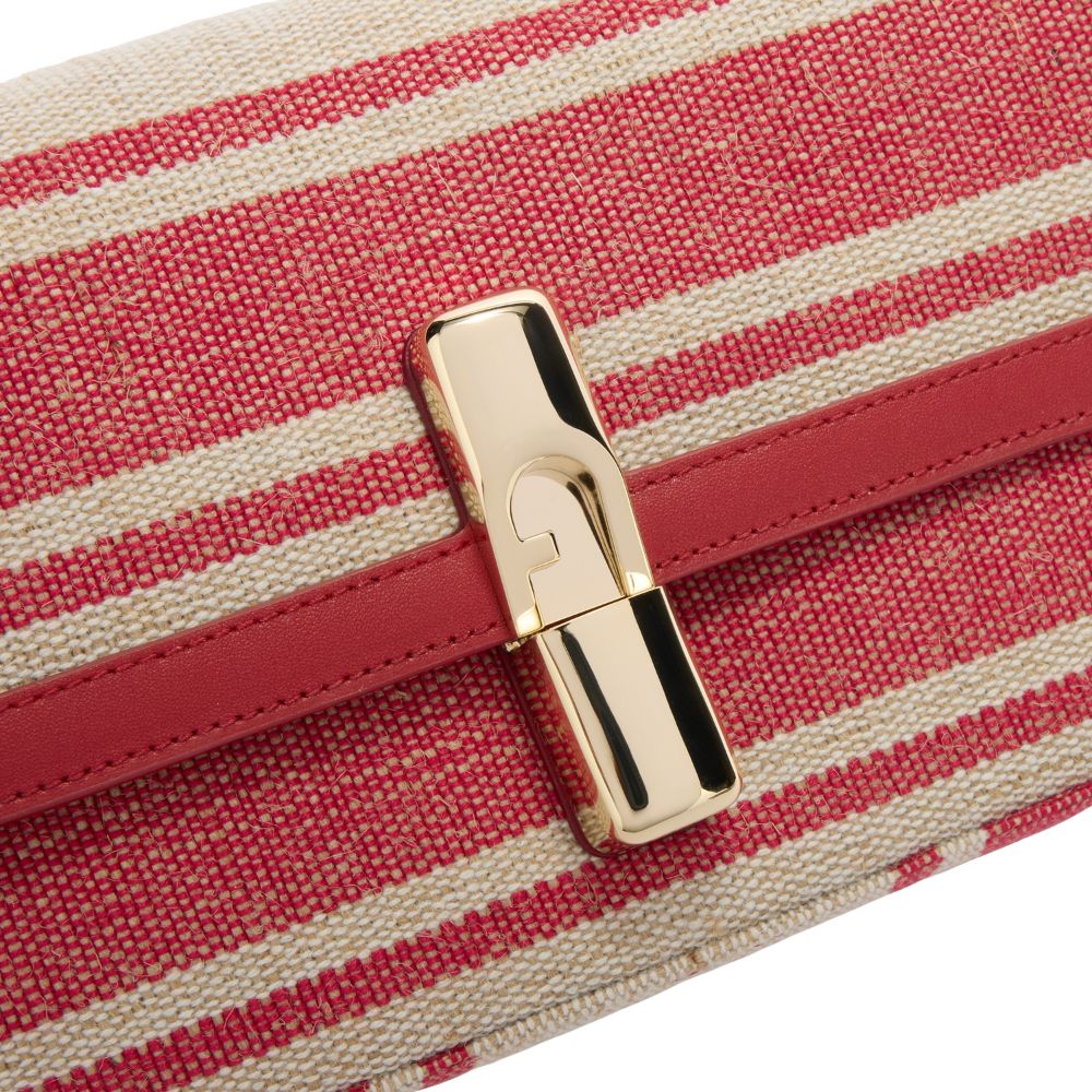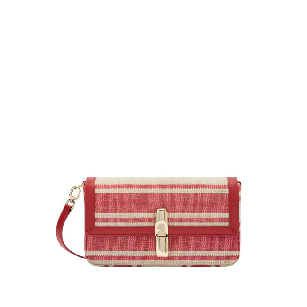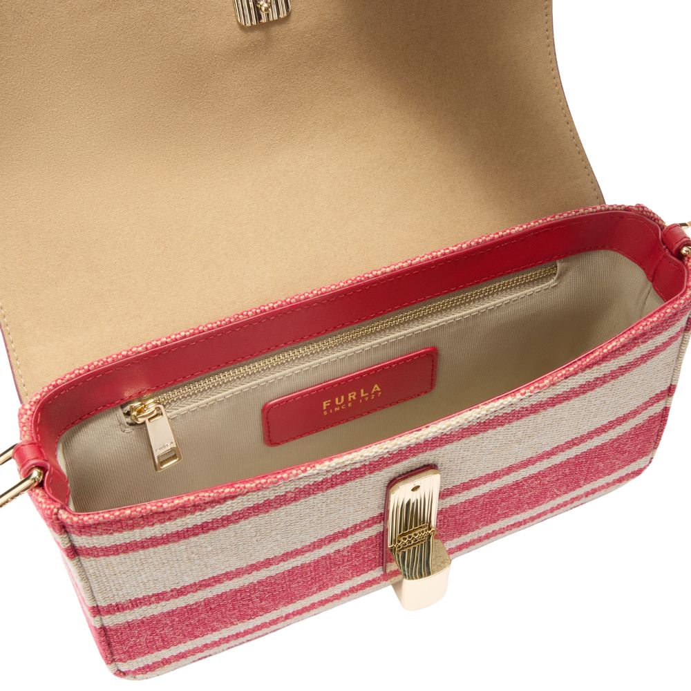 Furla's Iride shoulder bag features a versatile and contemporary design. The body of the compact size bag is made of canvas with striped design, finished with elegant and fine smooth leather details. Accompanied by the adjustable and removable shoulder strap, it features a magnetic closure embellished with cylindrical metal hardware with the iconic Arco Furla logo.