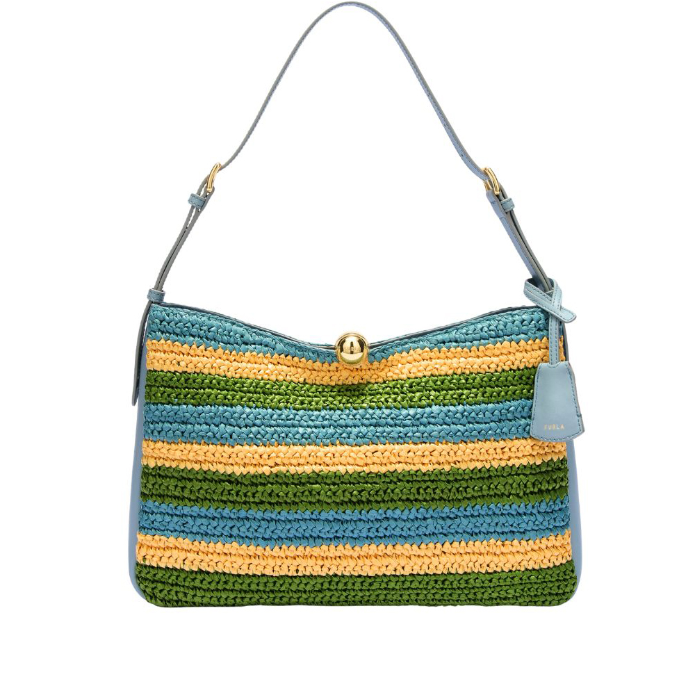 Furla's Sfera Soft shoulder bag has an elegant design with a refined allure. Crafted from raffia crochet with a striped design and smooth leather details, it is embellished with round Sphere hardware that recreates a natural draping movement. The large size is perfect for storing all your belongings and the flexible structure fits over your shoulder.