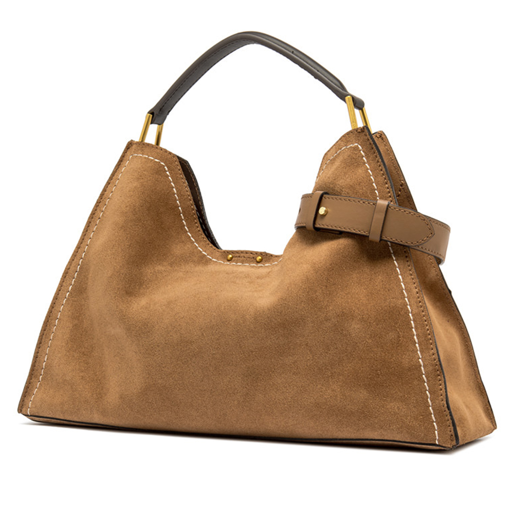 The Aurora shoulder bag by Gianni Chiarini Firenze stands out for its trapezoidal shape, a perfect combination of contemporary elegance. Crafted from soft suede, it is enriched with metal details and contrasting topstitches that enhance its design. Featuring an adjustable and removable leather shoulder strap, it offers a dual portability mode. Complete with a handy zip-lock clutch, this bag also features a magnet top closure for added security and convenience.