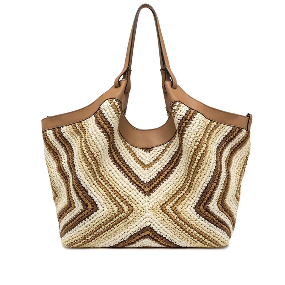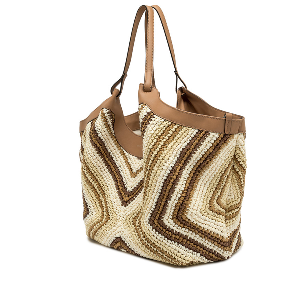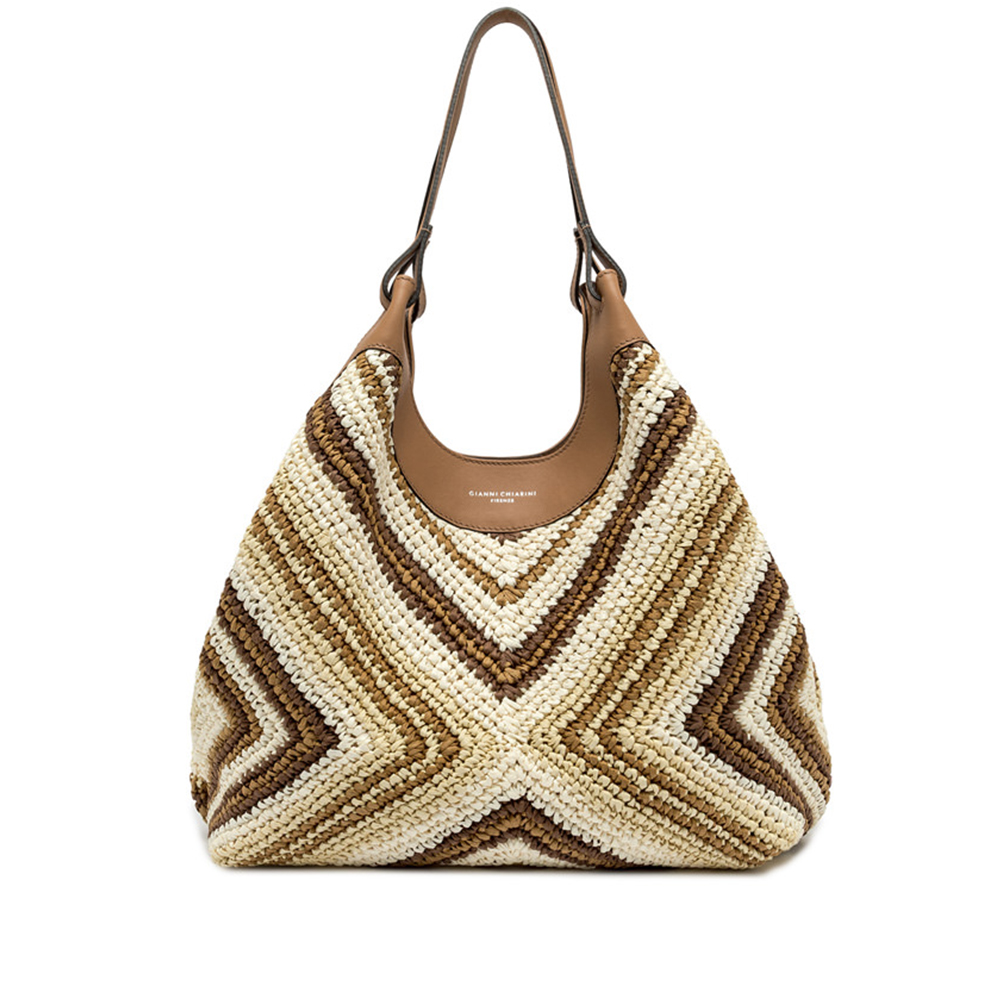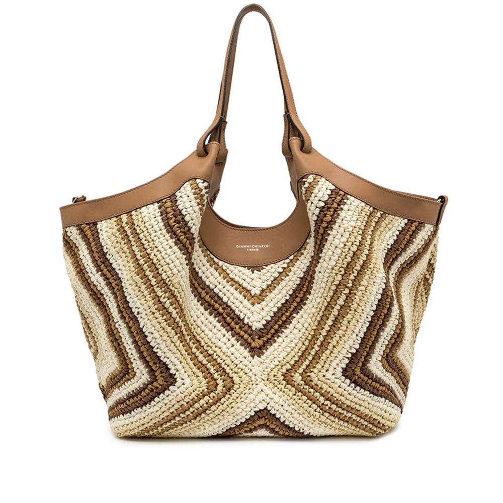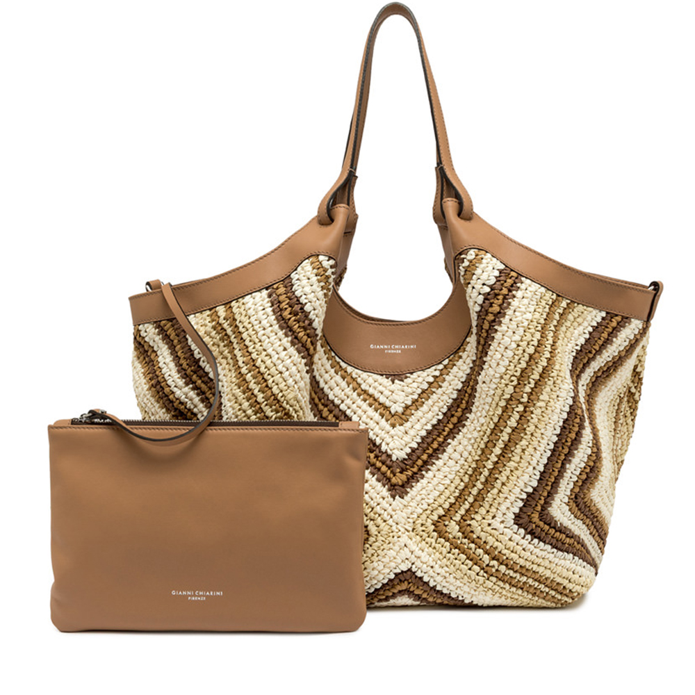 The brand icon, the DUA bag, by Gianni Chiarini is made of woven straw, characterized by a unique and distinctive texture. Equipped with a single compartment, it features leather upper profiles and double matching handles. Practical and essential, it is perfect to complete each look with style. Equipped with a practical zip-lock clutch.