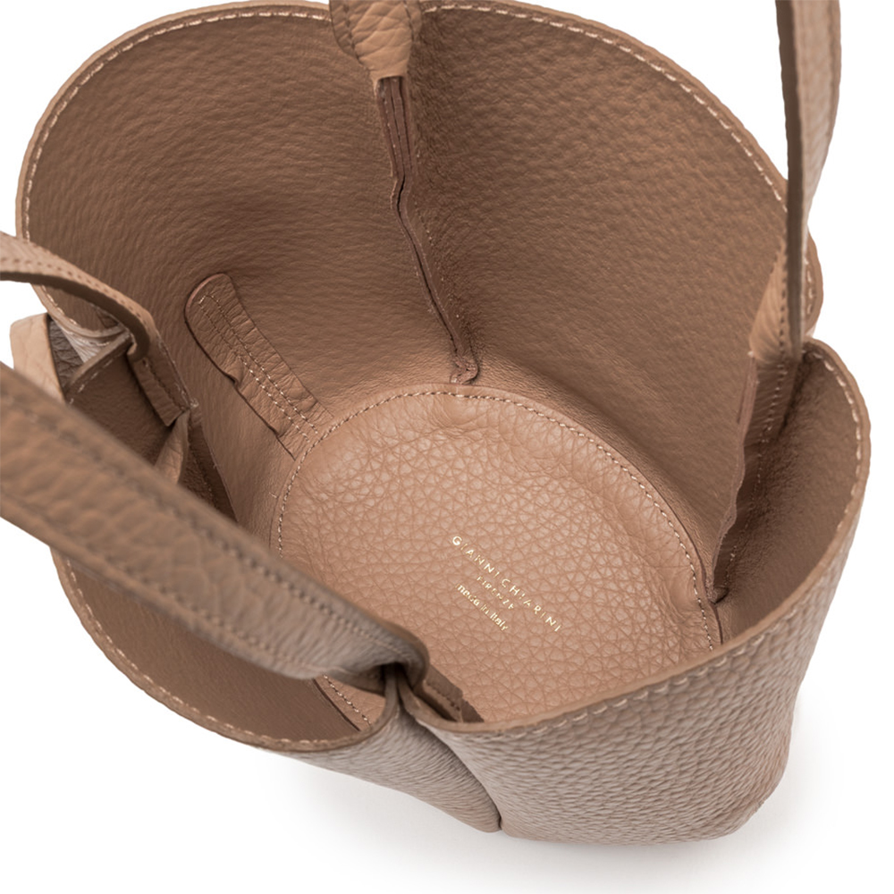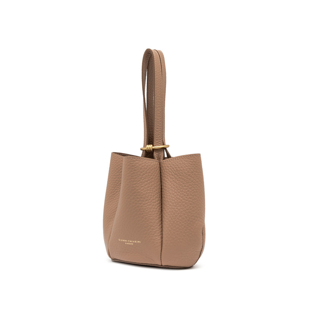 Lily is Gianni Chiarini's new bag, made of bubble double leather with a maxi grain and featuring a unique and sophisticated flower silhouette. Equipped with two leather handles, enriched by the iconic metal knot that gives a contemporary touch. The closure is made by inserting the handles into a metal ring embellished with the same knot, a decorative charm of great trend.
