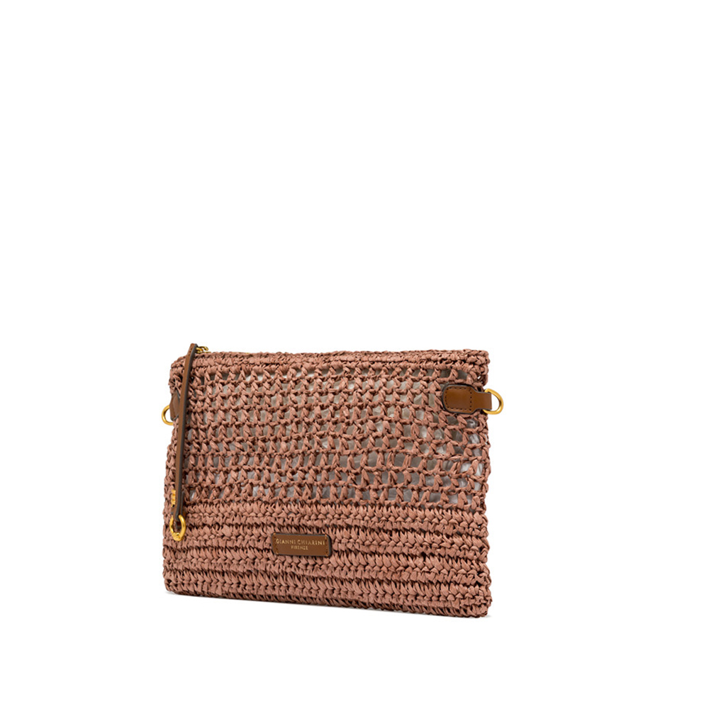 Nefeli is Gianni Chiarini's new pouch with a rectangular silhouette, made of crochet straw, perfect for tackling summer days with lightness and style. It features a zip closure and metal details that add a bright touch to the design. Equipped with a practical and removable shoulder strap for versatile use.