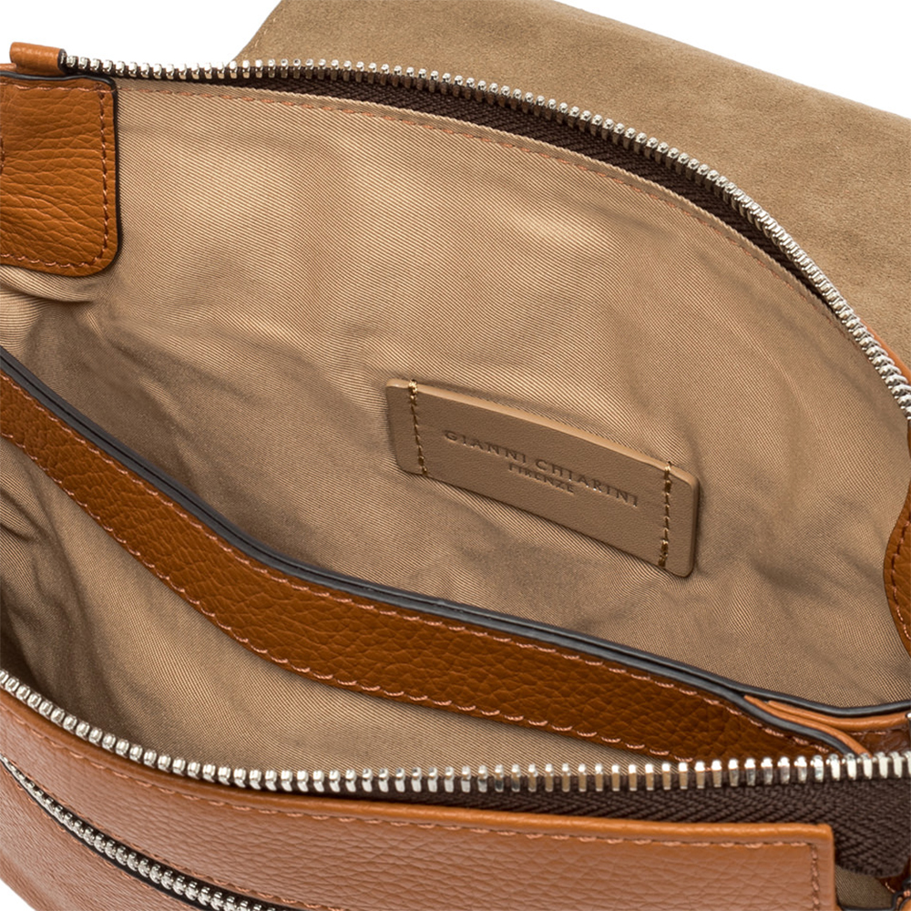 The Three bag by Gianni Chiarini is made of fine hammered leather. Young and fun is composed of two sachets that converge at the top in the detail of the zip. To wear with the most casual outfits but also for an elegant evening to embellish a simple and monochrome look.