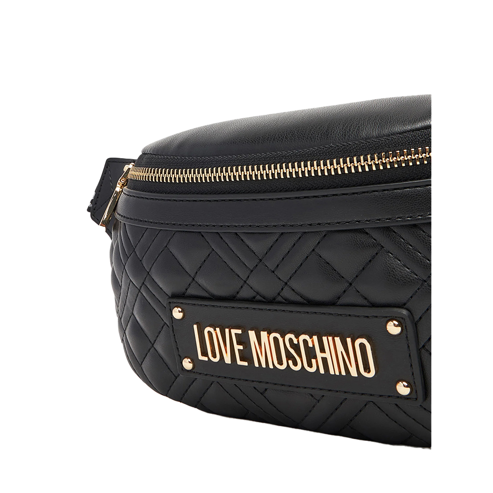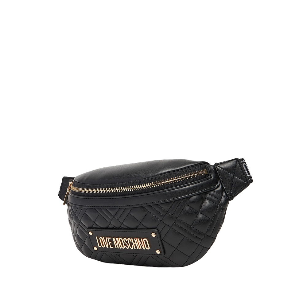 The Quilted bum bag by Love Moschino with a masculine taste, equipped with a practical and secure zip closure and an adjustable belt. Irreplaceable ally of free time looks.