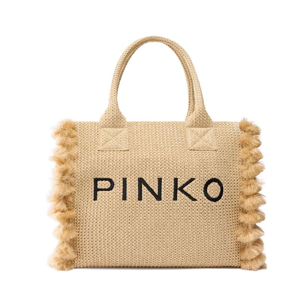 Beach Pinko medium-sized, slightly elongated rectangular shopper bag made of raffia and personalized with the PINKO lettering logo embroidered in tone on the front. The model, perfect for use as a beach bag to take to the beach, is enriched with side edges with a twisted and slightly frayed effect decoration, and features a top handle with frayed inner edges for hand or shoulder wear. The closure is instead entrusted to a zip that reveals an interior lined with cotton drill equipped with a convenient wall pocket.