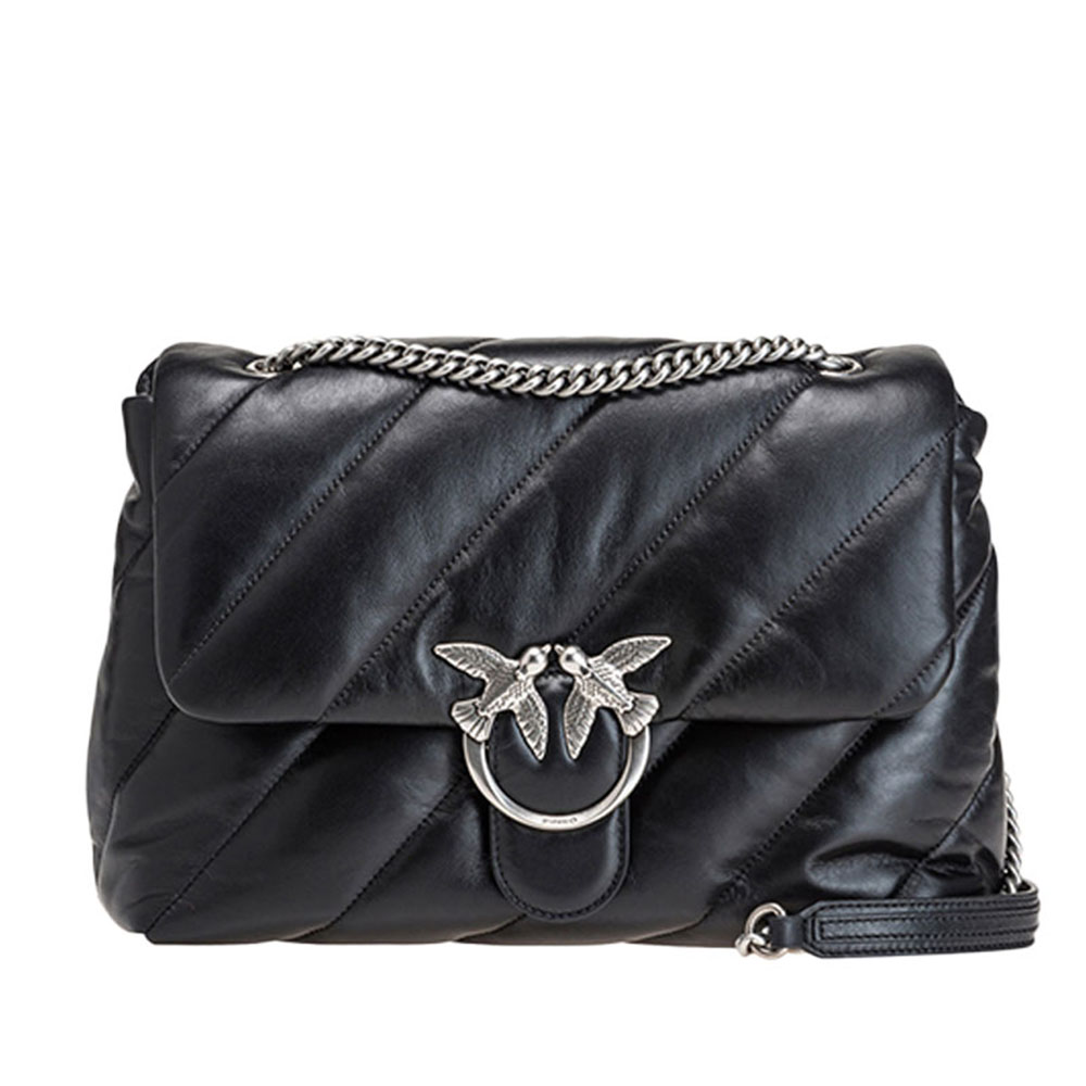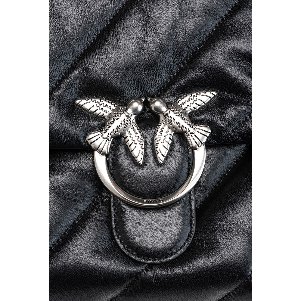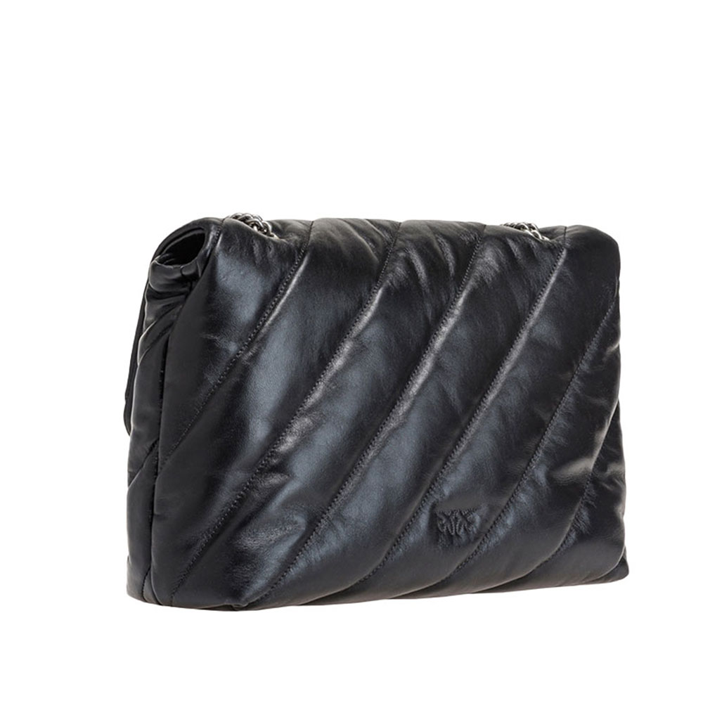 The Big Love Puff bag by Pinko in soft nappa with maxi oblique quilting. The closure is completed by the iconic Love Birds Diamond Cut metal buckle. Ideal with any outfit.