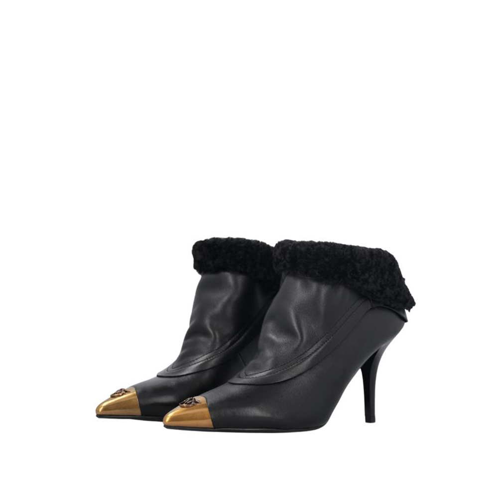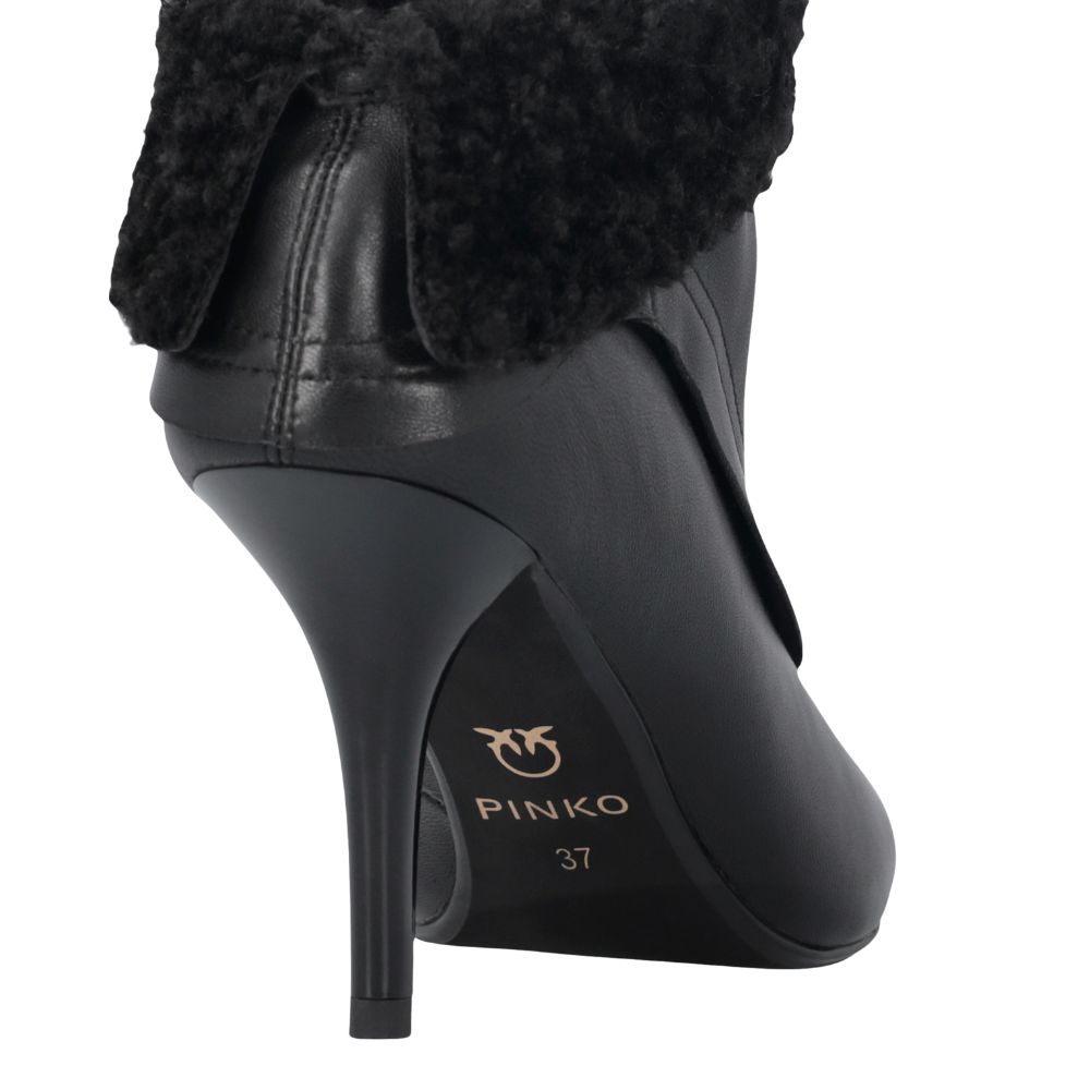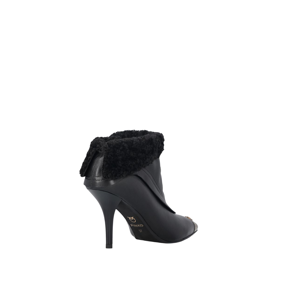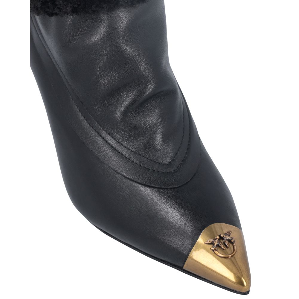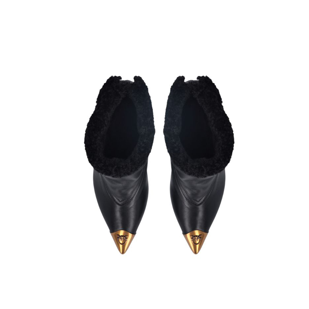 Pinko ankle boots with a feminine silhouette, made of soft leather with a shiny effect and equipped with a 10 cm high upper. The thin 7cm high heel slims the figure without sacrificing comfort, while the fur-effect Aspen fabric lining offers softness, for a perfect balance between style and functionality. The model is completed by the metallic gold galvanic tip, accompanied by the Love Birds logo, which adds a rock accent. Thanks to its versatility, this model will accompany you on the most special occasions, for example in combination with a refined skirt.